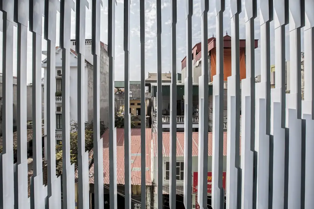 Mặt tiền được xử lý bằng hệ thống các thanh thép dọc kết hợp với các tấm thép dày 3mm. Mật độ cũng như sự giao thoa của sóng thép hai chiều phụ thuộc vào mục đích đảm bảo sự riêng tư cho căn phòng bên trong. Toàn bộ mặt tiền bằng kính được thiết kế lùi vào bên trong để tạo không gian đệm, tránh ánh nắng trực tiếp vào mùa hè nhưng vẫn cho phép ánh nắng mùa đông chiếu sâu vào bên trong.