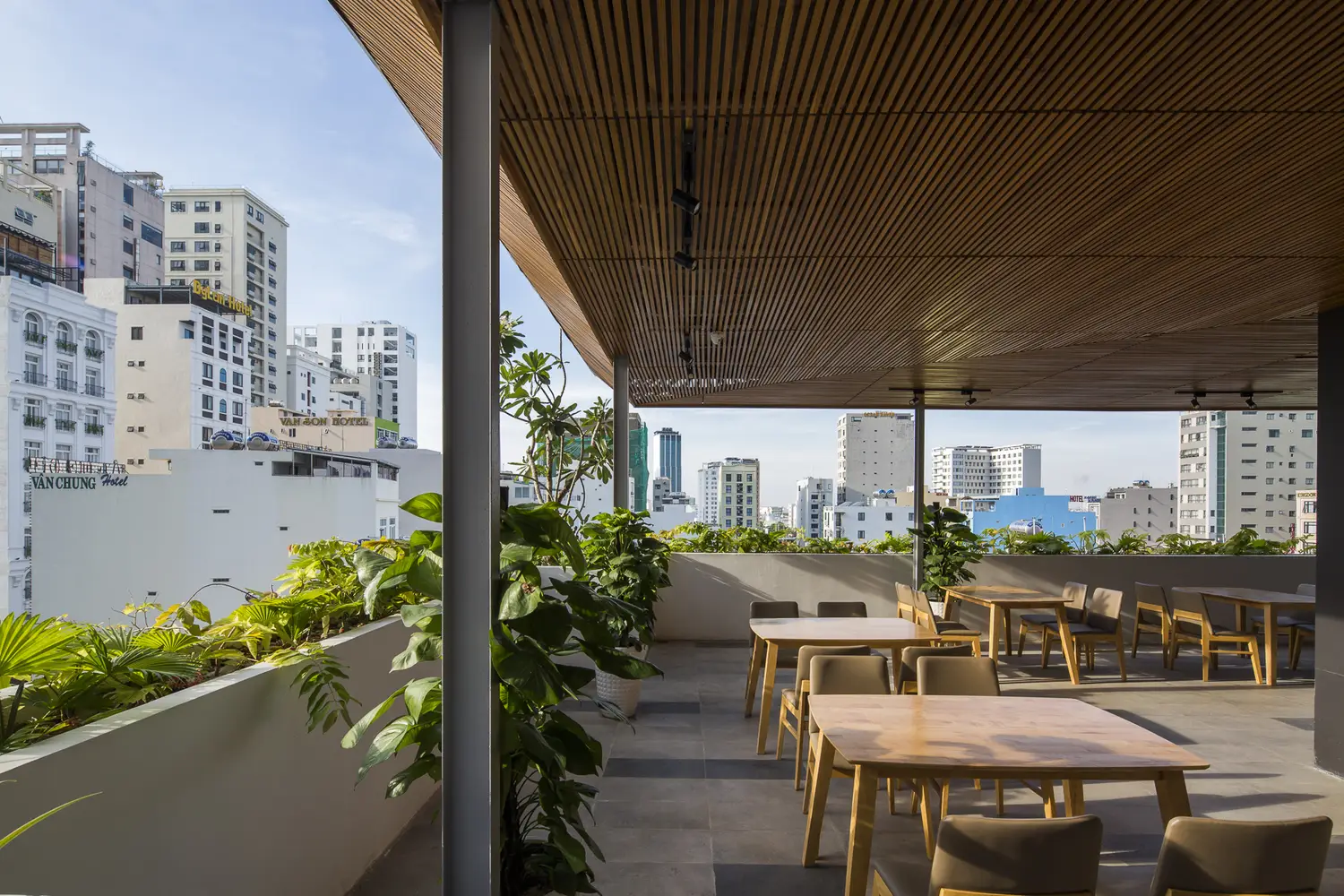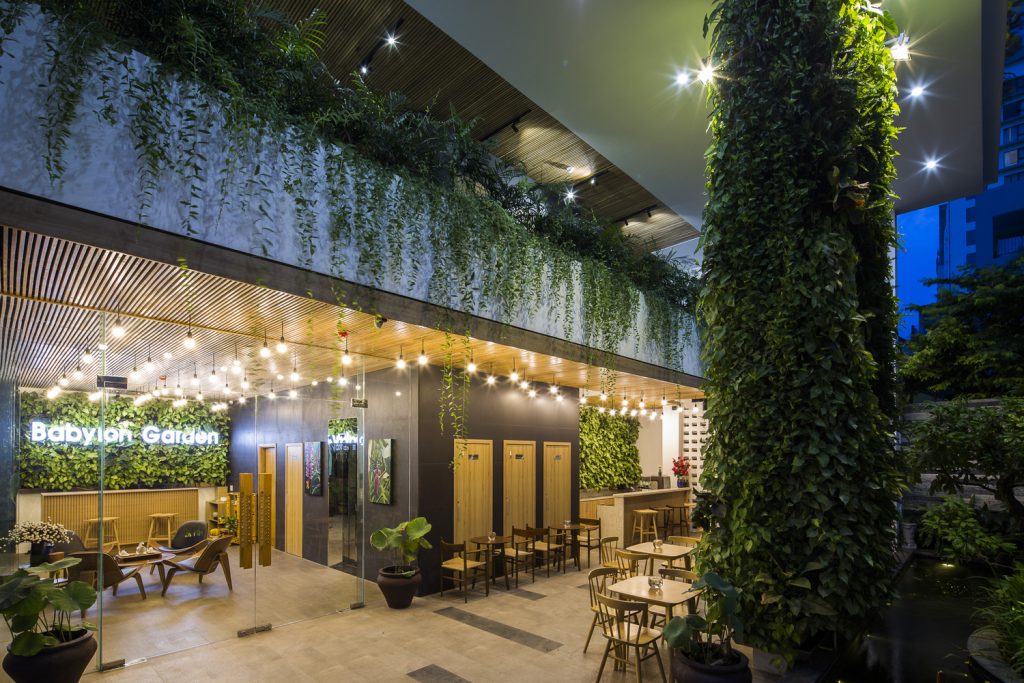 Vị trí của Babylon Garden trong con hẻm nhỏ gần Ha Bong ban đầu không thuận lợi vì khu đất bị bao quanh 3 phía bởi các tòa nhà chung cư thấp tầng cũ. Giải pháp của Ho Khue Architects (ALPES Green Design & Build) là xây dựng cao tầng, kết hợp kính phản quang, ban công và cây xanh. Công trình hòa quyện với thiên nhiên giữa những khối bê tông. Một ốc đảo cho phép khách trải nghiệm không khí biển trong lành, cây xanh và cảm thấy thoải mái khi trở về khách sạn tự nhiên này trong những ngày hè nóng bức. Khách sạn 6 tầng có 13 phòng nghỉ được trang bị tinh tế, tiện nghi và đạt chất lượng cao nhất trong từng chi tiết. Có nhà hàng, quán cà phê Hồ Cá Koi được bao quanh bởi những bức tường cây xanh, bàn bi-a và phòng tập thể dục. Mặc dù có thể xây thêm phòng, chúng tôi đã thiết kế mỗi phòng nằm ở góc, mang đến hai tầm nhìn và sự thông thoáng tuyệt vời với không khí biển tự nhiên cho mỗi phòng.