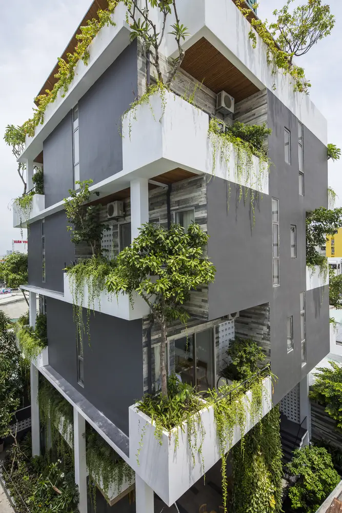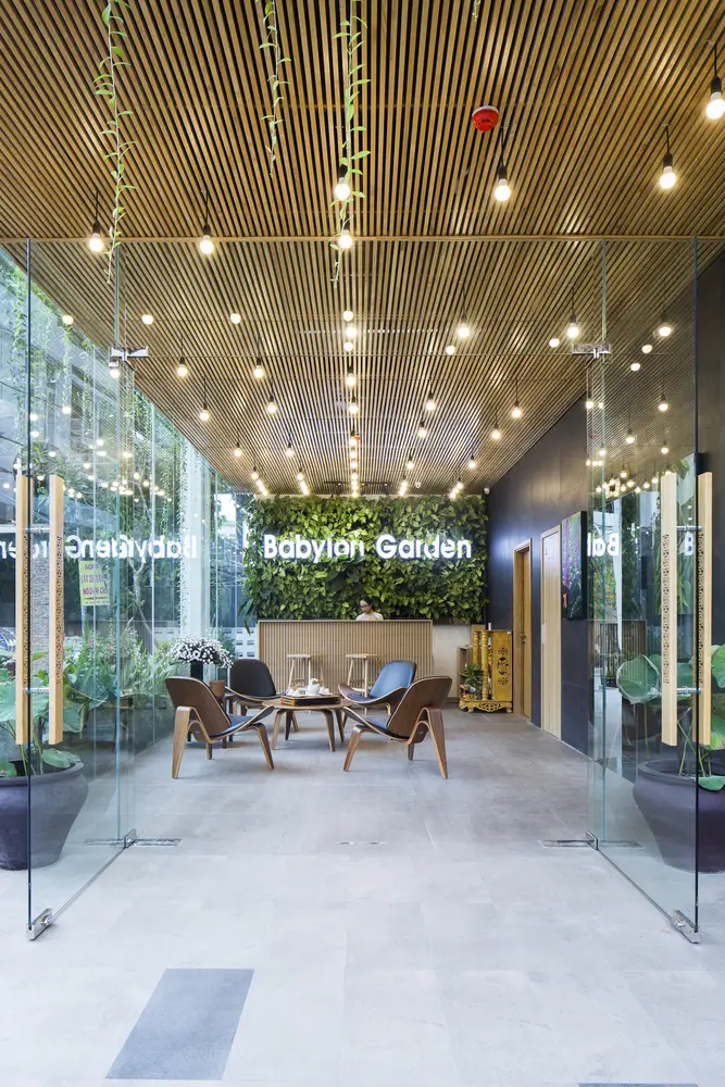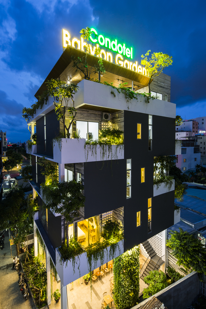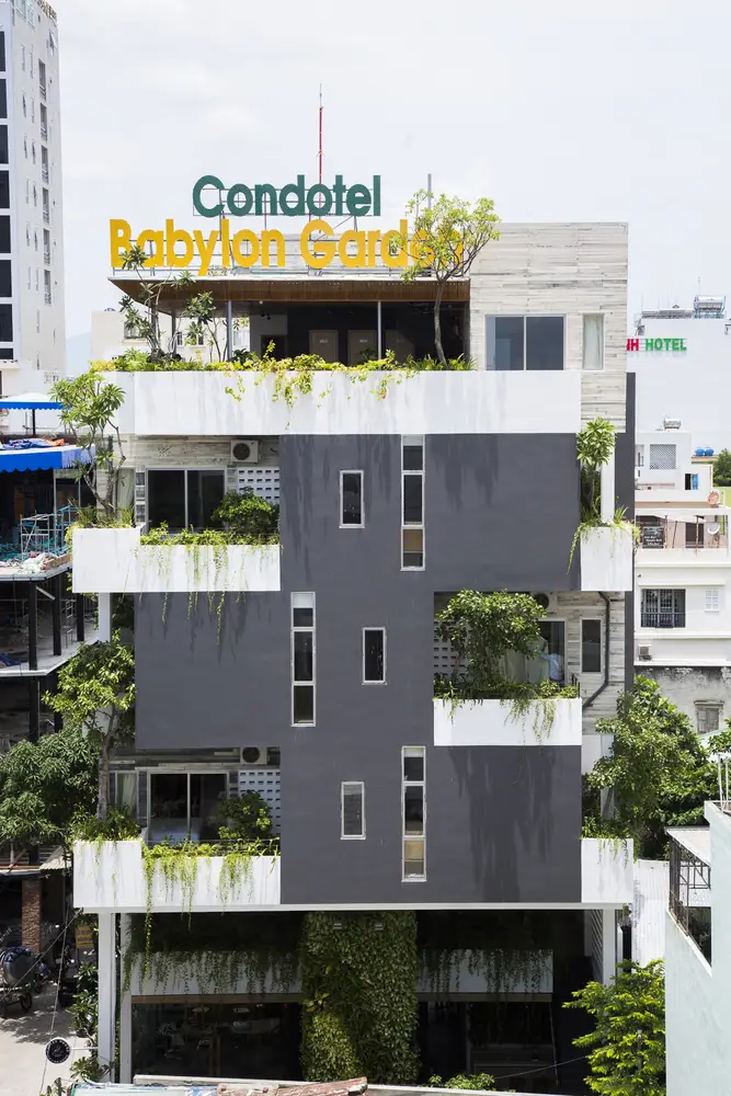 Mô tả bằng văn bản do các kiến trúc sư cung cấp. Babylon Garden tọa lạc trong khu vực khách sạn ven biển đông đúc gần bãi biển nổi tiếng nhất Đà Nẵng. Nằm cách một con phố nhỏ 25 mét, nơi đây thu hút bởi vẻ ngoài xanh mát hiện đại như một ốc đảo giữa sự ồn ào náo nhiệt và mọi thứ xung quanh đều to lớn và tẻ nhạt. Nơi đây mang đến trải nghiệm thiên nhiên thanh bình trong khi chỉ cách sự hối hả, nhộn nhịp và mọi dịch vụ mà du khách cần vài bước chân. Thách thức trong thiết kế đối với Ho Khue Architects (ALPES Green Design & Build) là xây dựng một công trình đặc biệt, gần nhưng tách biệt khỏi “con đường chính”, vừa nổi bật vừa đẹp mắt.