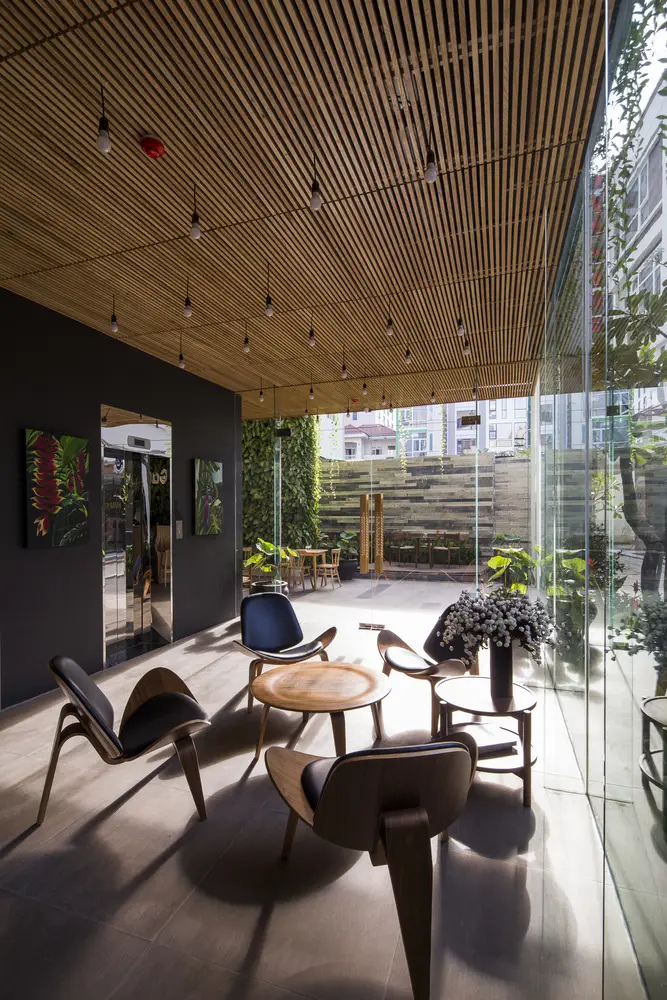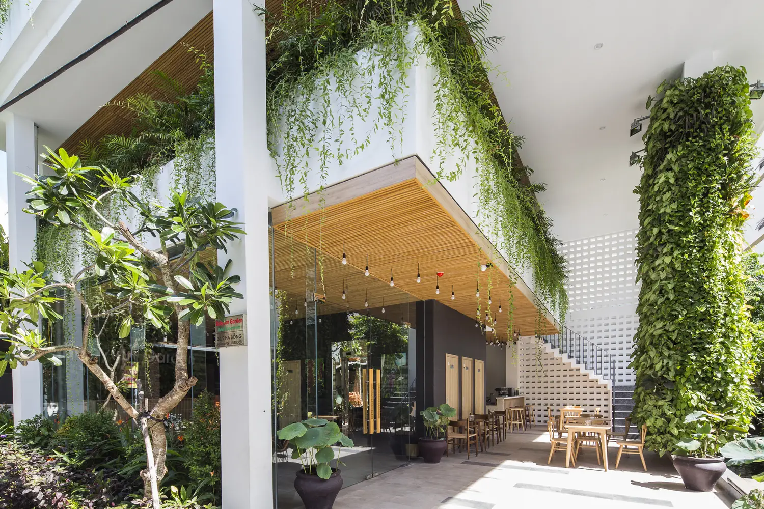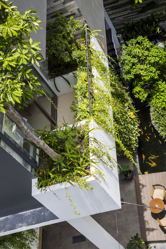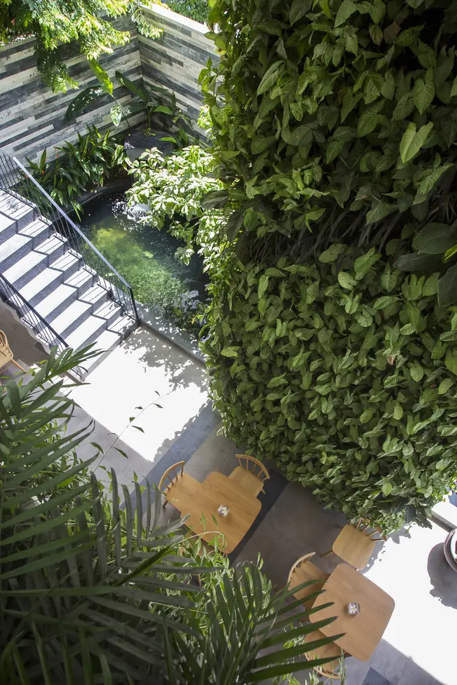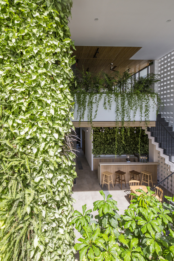 Tầng 1 và tầng lửng có cây xanh mọc sát mặt đất và các loại cây leo rủ xuống từ các chậu cây của nhà hàng ở tầng 2. Các hộp trồng cây thẳng đứng chuyên dụng được sử dụng để tạo hiệu ứng đẹp mắt này. Khu vực phía trước bị thu hẹp bởi con hẻm, nhưng tầm nhìn và cảm giác bên trong được mở rộng nhờ cây xanh thẳng đứng, hồ cá Koi, hệ thống thông gió tự nhiên ở bức tường phía sau và trần nhà rất cao. Ai cũng nhận ra một cảnh quan kiến trúc độc đáo hoặc dễ chịu. Chúng ta cảm nhận chúng một cách vô thức. Ho Khue Architects (ALPES) yêu cầu các dự án của chúng tôi phải đáp ứng các yêu cầu về ánh sáng và thông gió, ngoài việc tạo ra các tòa nhà cao tầng mang tính biểu tượng trong không gian đô thị, khơi gợi cảm xúc.