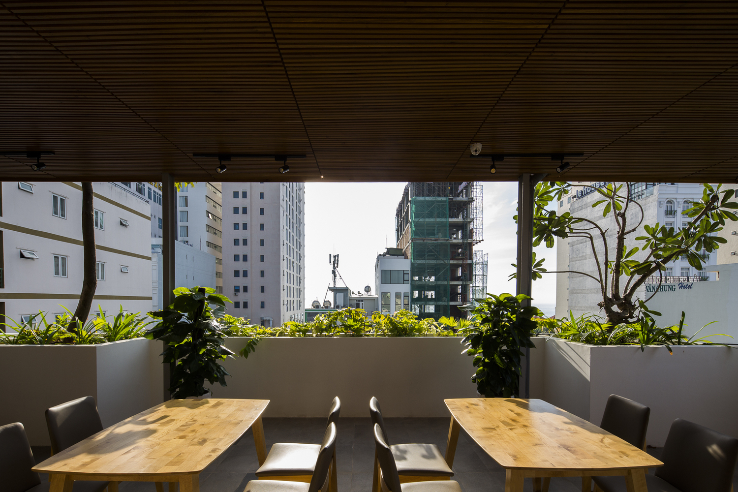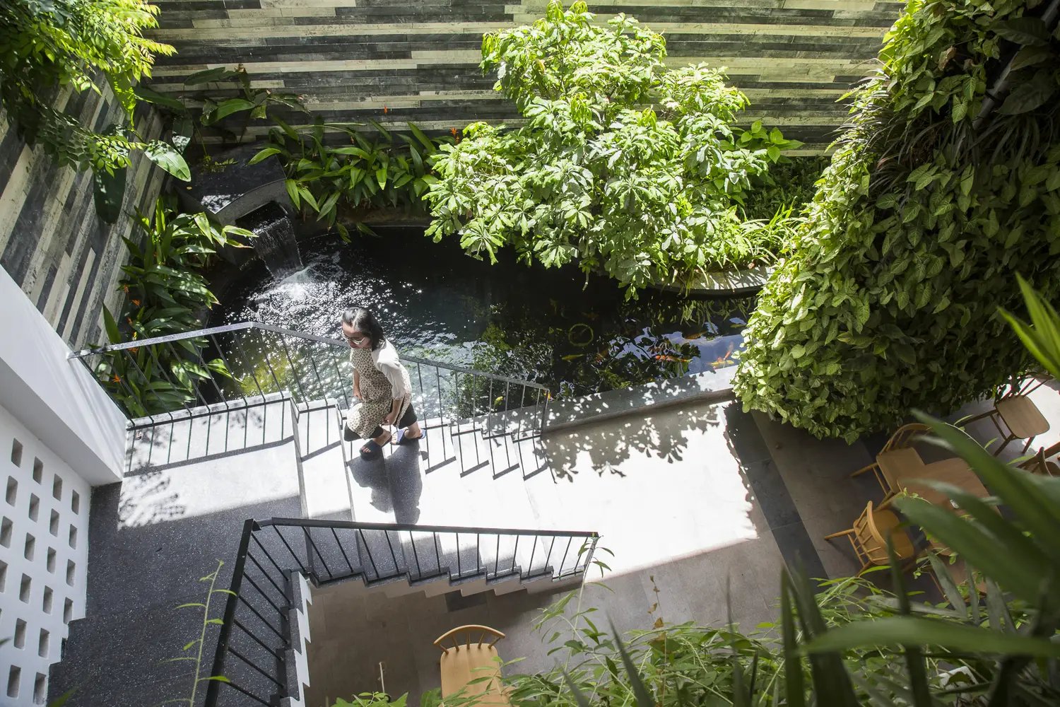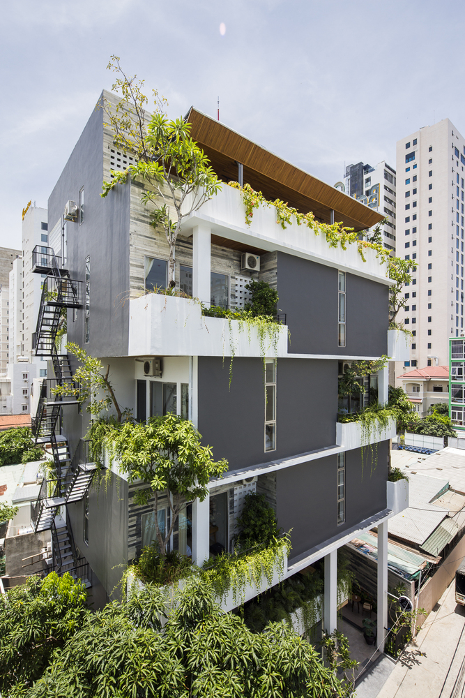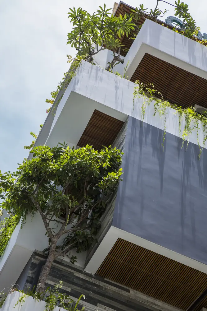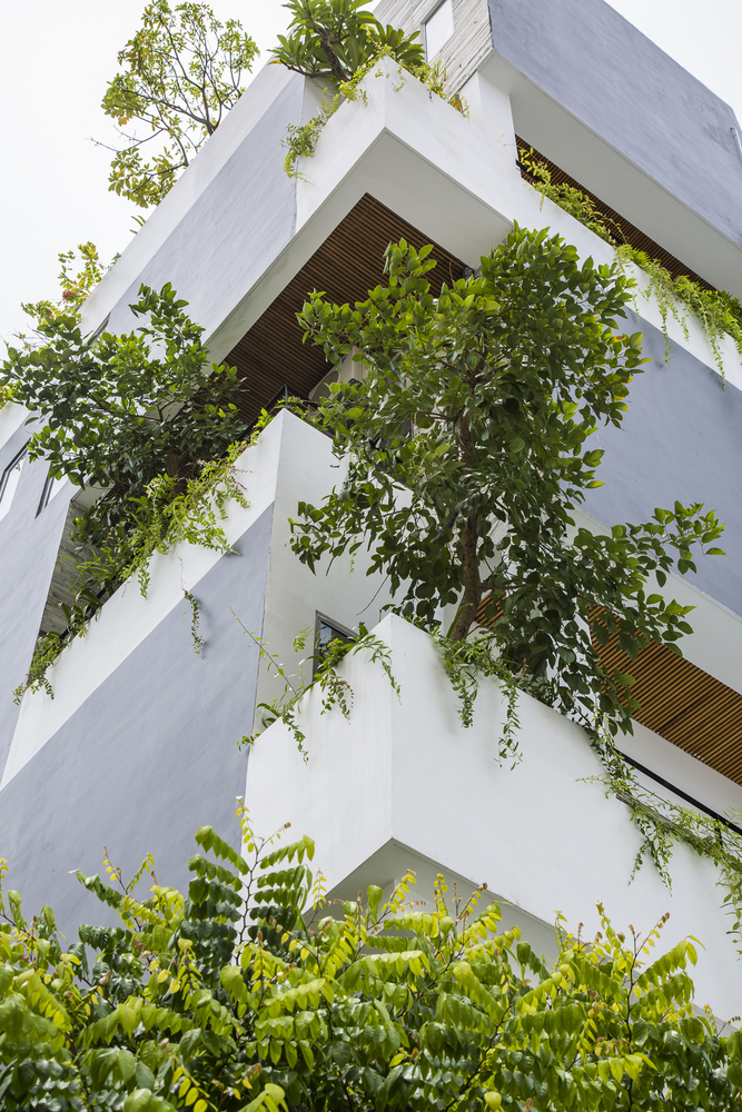 Tầng 1 và tầng lửng có cây xanh mọc sát mặt đất và các loại cây leo rủ xuống từ các chậu cây của nhà hàng ở tầng 2. Các hộp trồng cây thẳng đứng chuyên dụng được sử dụng để tạo hiệu ứng đẹp mắt này. Khu vực phía trước bị thu hẹp bởi con hẻm, nhưng tầm nhìn và cảm giác bên trong được mở rộng nhờ cây xanh thẳng đứng, hồ cá Koi, hệ thống thông gió tự nhiên ở bức tường phía sau và trần nhà rất cao. Ai cũng nhận ra một cảnh quan kiến trúc độc đáo hoặc dễ chịu. Chúng ta cảm nhận chúng một cách vô thức. Ho Khue Architects (ALPES) yêu cầu các dự án của chúng tôi phải đáp ứng các yêu cầu về ánh sáng và thông gió, ngoài việc tạo ra các tòa nhà cao tầng mang tính biểu tượng trong không gian đô thị, khơi gợi cảm xúc.