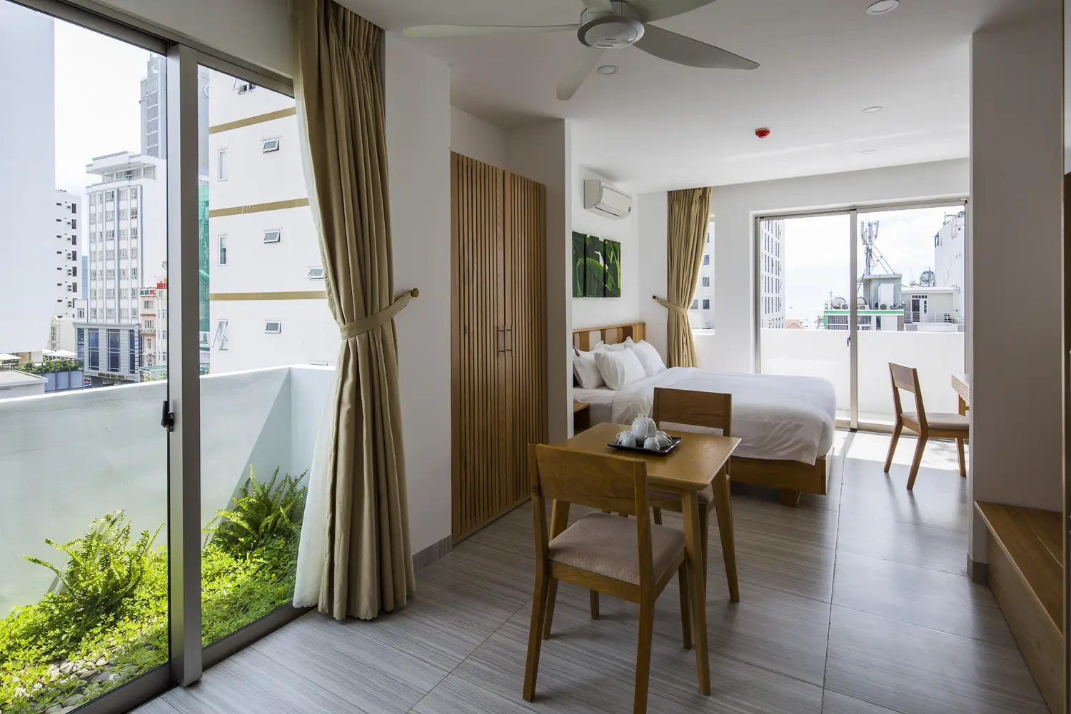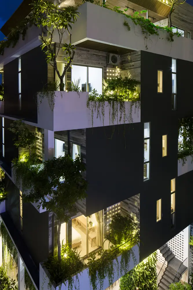 Mỗi phòng ngủ đều có ban công riêng thư giãn, nơi có nhiều loại cây xanh và lan can, vị trí của lan can thay đổi theo từng tầng. Sự “đung đưa” của các ban công xung quanh tòa nhà tạo nên một vẻ đẹp độc đáo, như thể đang chuyển động. Ho Khue Architects (ALPES) mong muốn xây dựng những công trình vĩ đại và vững chắc, đồng thời chú trọng đến cảm xúc của người sử dụng. Việc kết hợp cây xanh với đá tự nhiên và bê tông trang trí góp phần tạo nên cảm nhận tích cực về các công trình như một môi trường tự nhiên. Babylon Garden là một khu vườn treo hiện đại kết nối con người với thiên nhiên, chỉ cách khu du lịch nhộn nhịp vài bước chân.