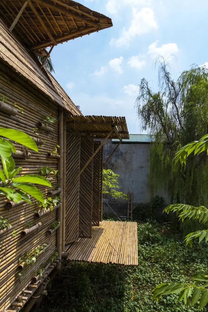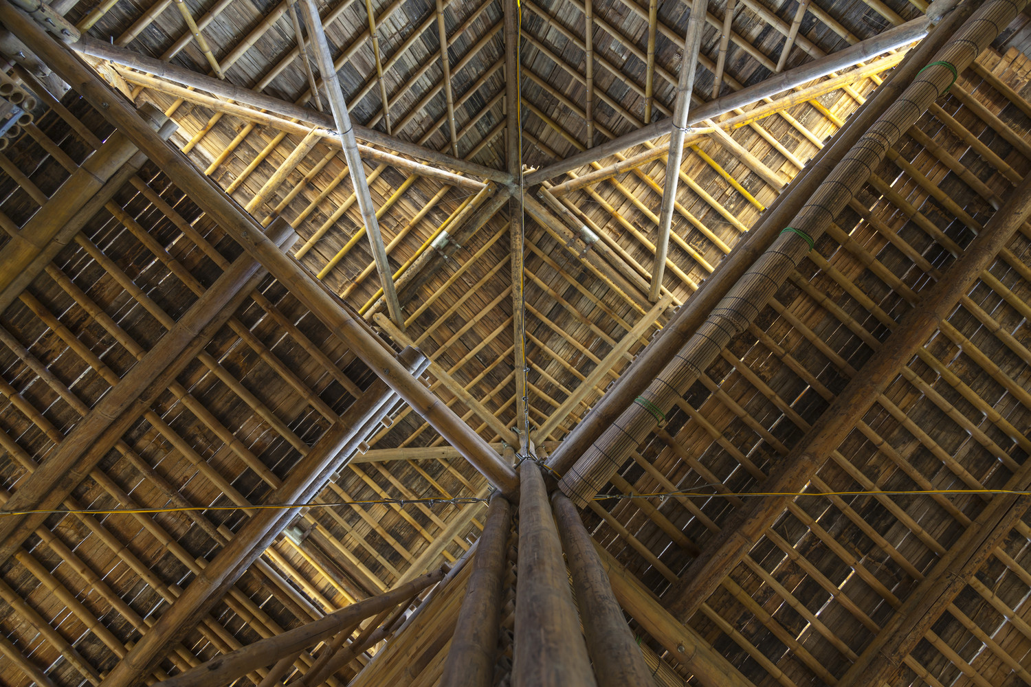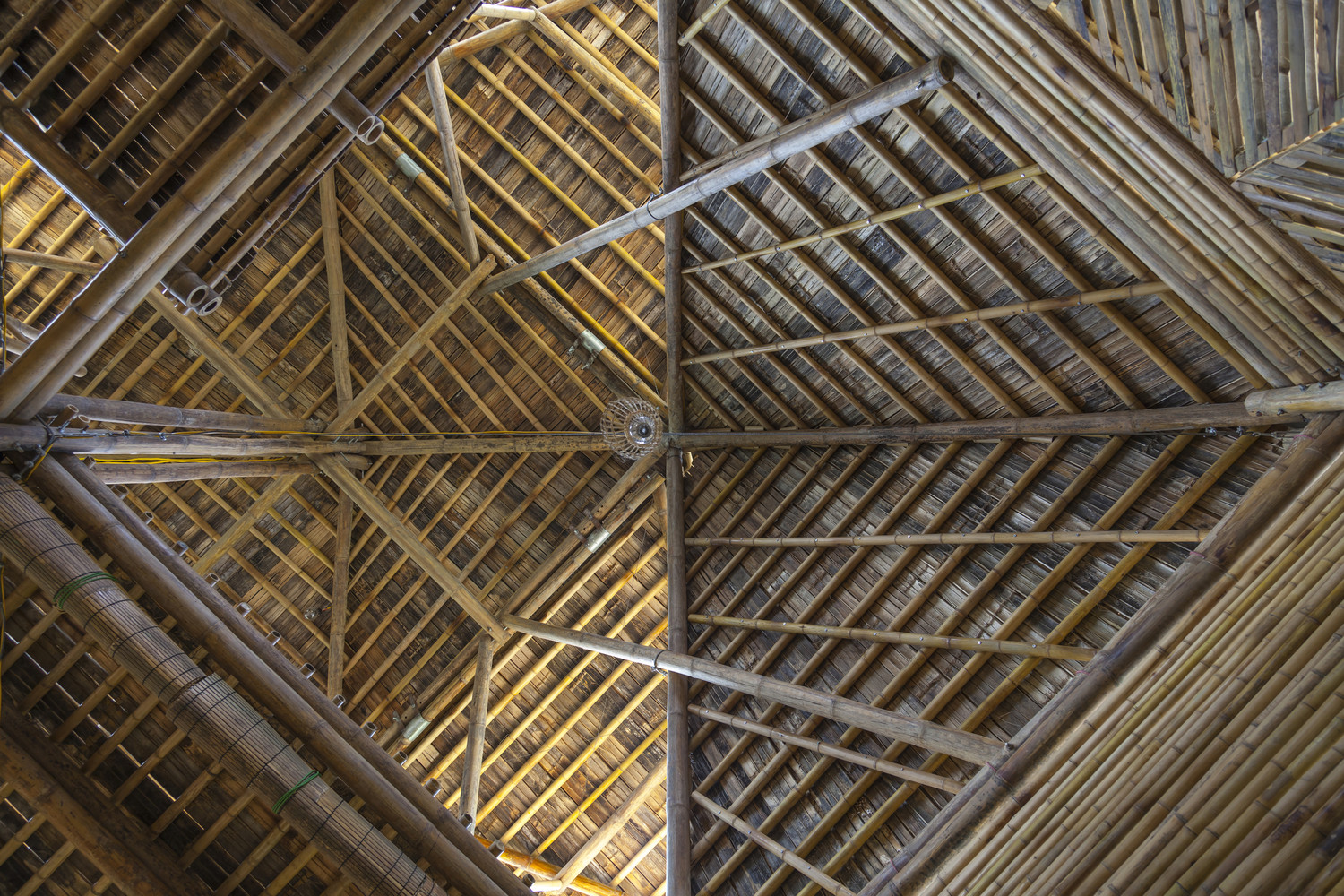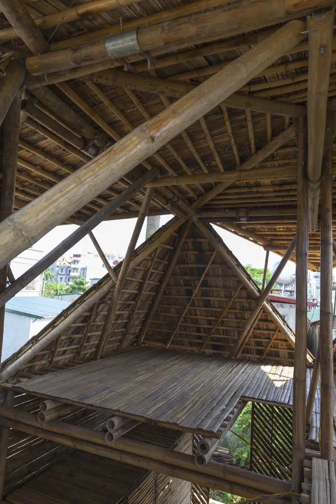 Từ khung cố định sử dụng tre f8-f10cm, phần mái nhà có thể được hoàn thiện theo khí hậu địa phương và vật liệu vùng miền (tre nhỏ f4-f5cm, tre đan, ván sợi, lá dừa…) để tạo nên kiến ​​trúc bản địa.