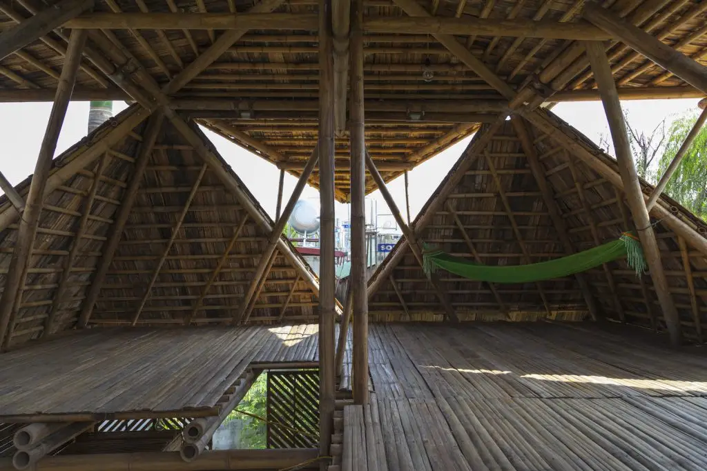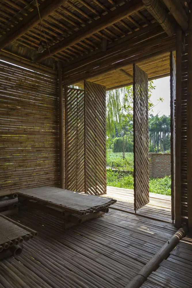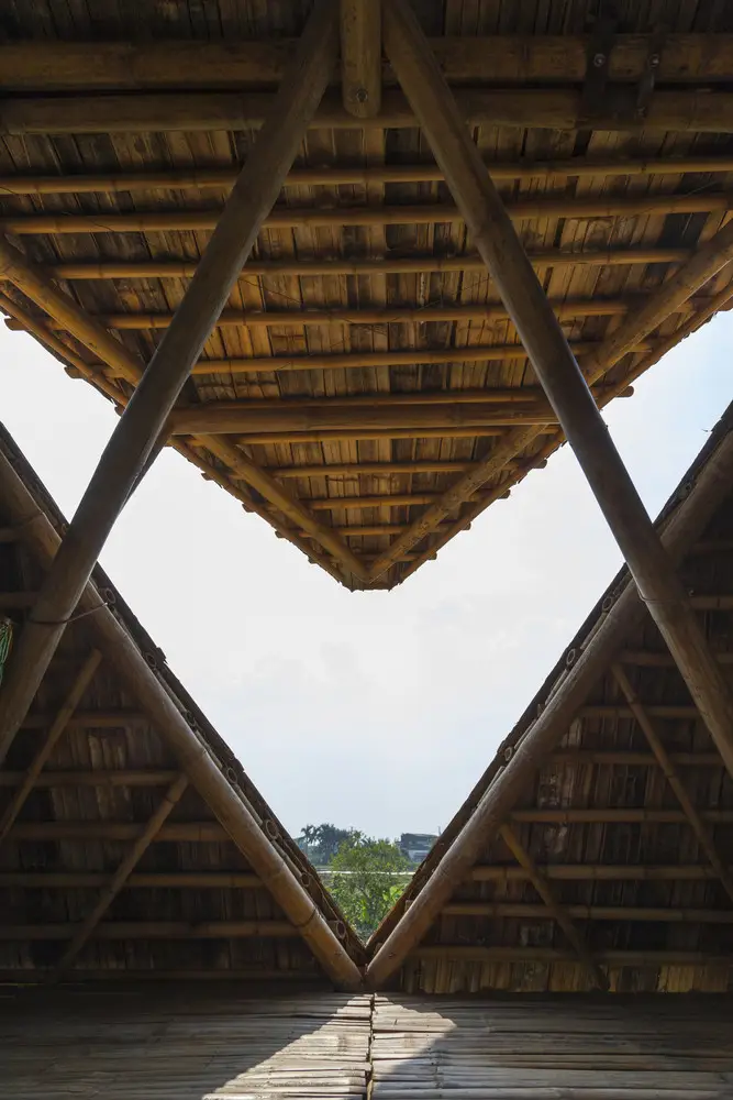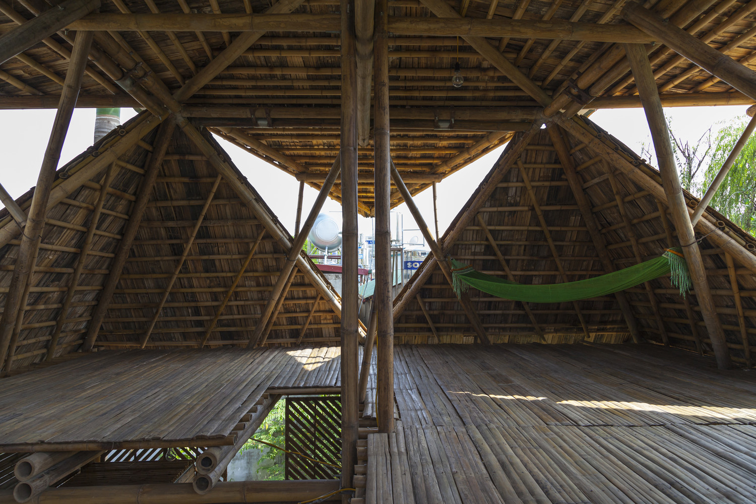 Từ khung cố định sử dụng tre f8-f10cm, phần mái nhà có thể được hoàn thiện theo khí hậu địa phương và vật liệu vùng miền (tre nhỏ f4-f5cm, tre đan, ván sợi, lá dừa…) để tạo nên kiến ​​trúc bản địa.