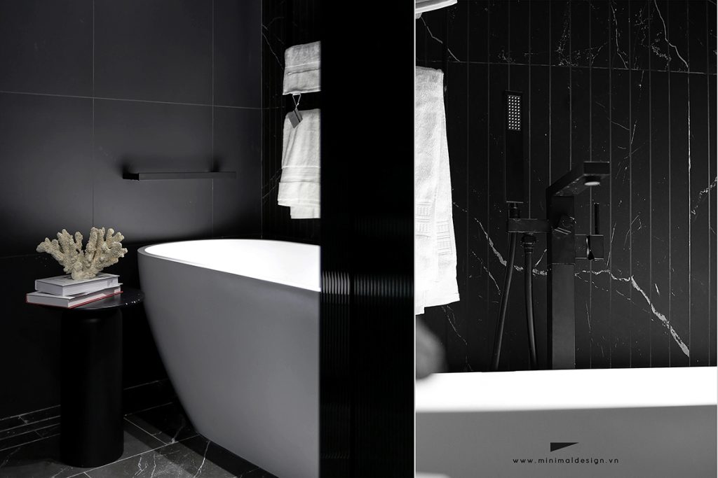 Sự tối giản và tinh tế không những thể hiện ở tổng quan căn hộ mà còn xuất hiện trên từng đường nét nội thất và cách vận dụng vật liệu, lẫn màu sắc vào thiết kế. Vật liệu chính là veneer đen có bề mặt gồ ghề vẫn giữ được nét tự nhiên vốn có của gỗ, tuy nhiên nó không ảnh hưởng nhiều đến vấn đề vệ sinh lau dọn. Khi được kết hợp thêm với ánh sáng đã tạo nên những hiệu ứng bóng đổ theo ngụ ý của KTS. Sàn gỗ engineer vì để có tone trắng phù hợp với màu trắng chủ đạo của cả căn hộ, đã được đặt làm riêng theo yêu cầu