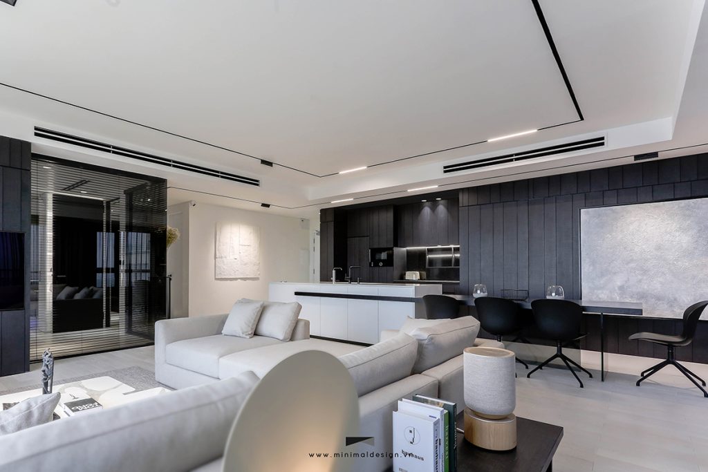 Không gian căn hộ với thiết kế hiện đại, sử dụng hai màu đen và trắng chủ đạo