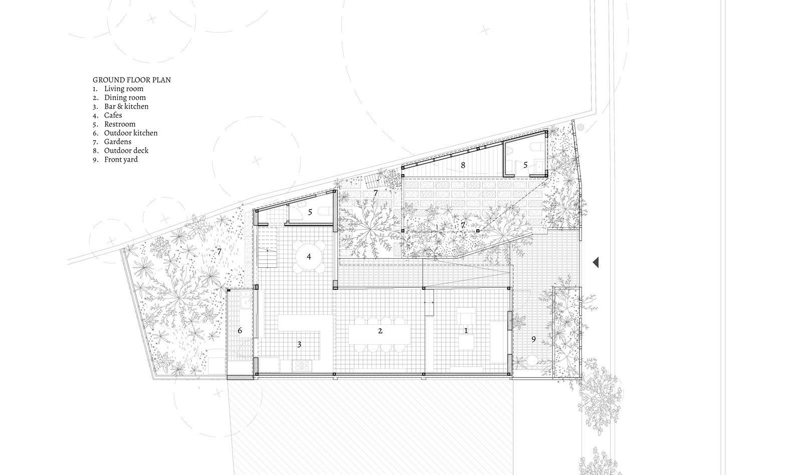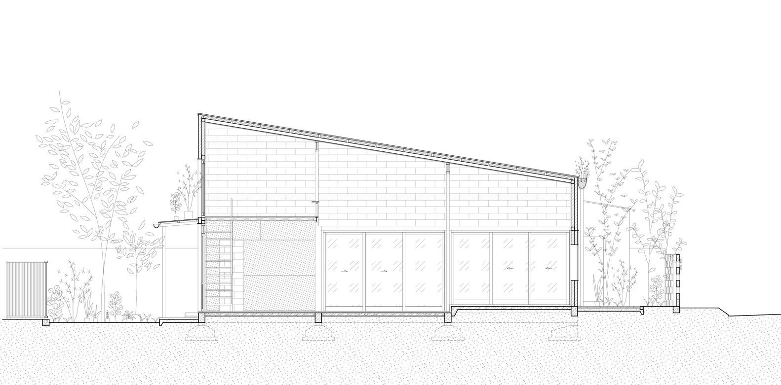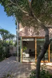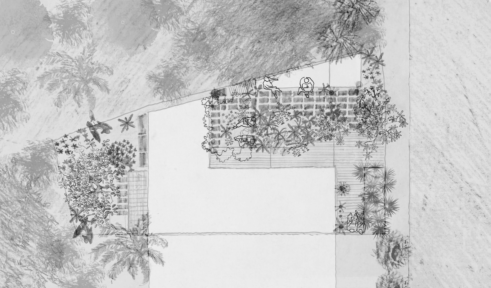 Việc chăm sóc khu vườn, với thảm thực vật bản địa, gợi nhớ đến truyền thống chăm sóc cây cối địa phương: cây cảnh xen kẽ với rau củ, cây ăn quả, cây leo và các loài cây che bóng. Hàng rào thấp và địa hình dốc của sân trước gợi nhớ đến những nét quen thuộc của những ngôi nhà vườn bản địa, đồng thời gián tiếp gợi nhớ đến bến sông ngay phía sau khu đất. Các ranh giới có thể điều chỉnh được càng làm tăng thêm cảm giác về chiều sâu của dự án.