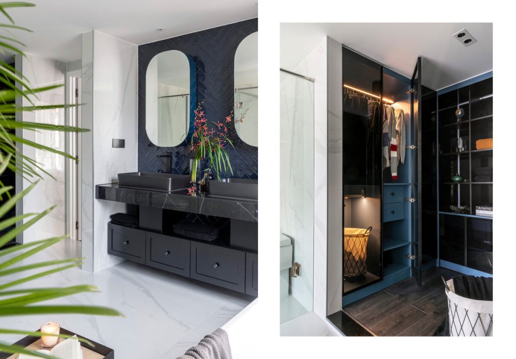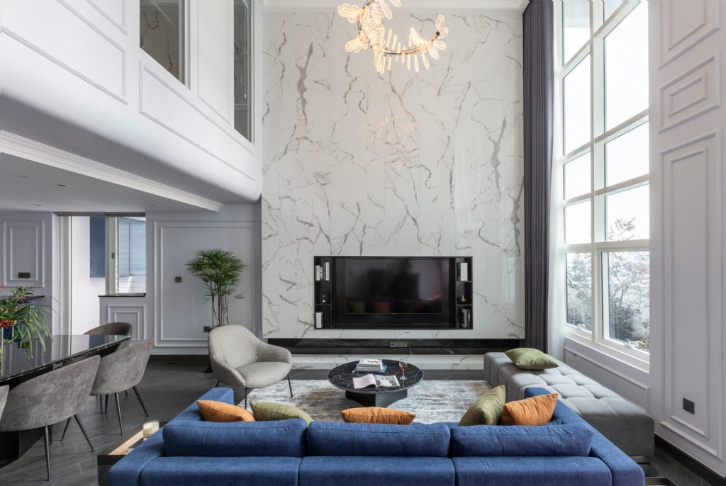 Trắng – xám là màu sắc chủ đạo thể hiện nét sang trọng và trang nhã, tone xanh đậm trở thành điểm nhấn chính, làm cho không gian trở nên sinh động hơn, bắt mắt hơn.