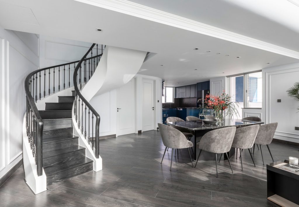 Căn hộ sử dụng đường uốn cong nhẹ nhàng kết hợp với các vật liệu: tường đắp chỉ, cầu thang xoắn thổi sự mới mẻ trong thiết kế nội thất.