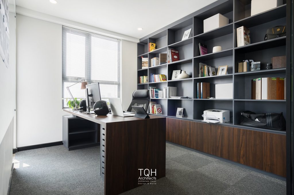 Điều đặc biệt là, tông màu trầm xám xanh kết hợp màu gỗ của kệ sách góp phần tạo một khoảng lặng cho không gian nơi đây, đó là điều cần thiết để gia chủ tập trung thực hiện công việc đạt hiệu quả tối ưu.