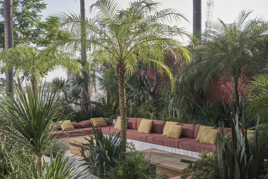 Cầu thang với những hình khối điêu khắc dẫn bạn lên sân thượng mở với tầm nhìn ngoạn mục, bao quát cảnh hoàng hôn trên sông Sài Gòn. Sân thượng không có lan can, thay vào đó là một băng ghế thấp bao quanh toàn bộ sàn, vừa để bảo vệ vừa tạo vẻ đẹp, cùng với một dải cây xanh rộng 1,5m bao quanh sân thượng. Khối kiến trúc mô phỏng hình khối lập phương của những ngôi nhà Địa Trung Hải ở Hy Lạp, Ý và Tây Ban Nha, tạo nên cảm giác nổi bật.
