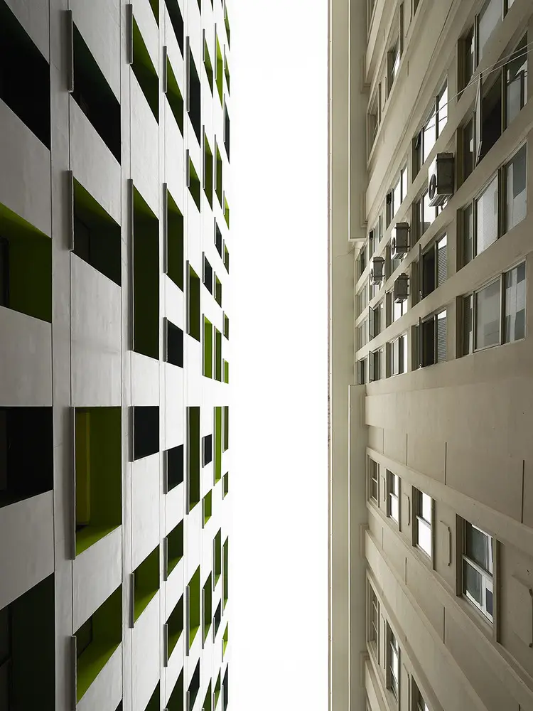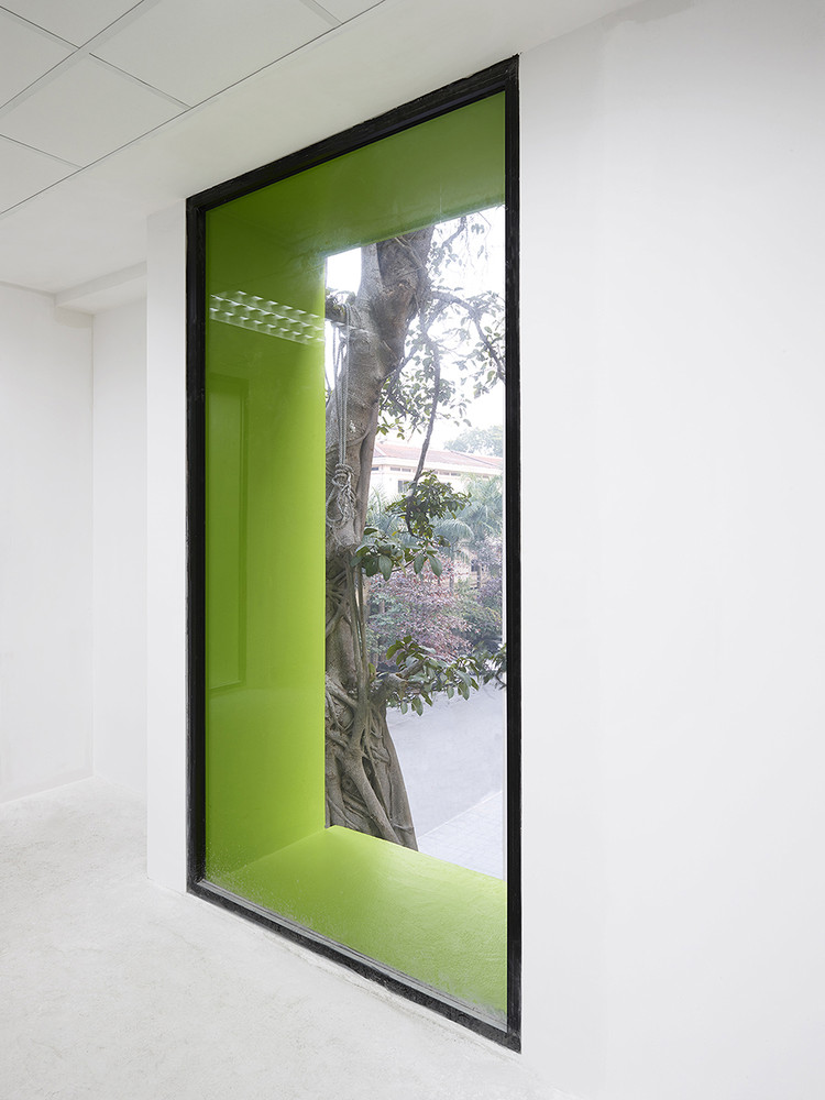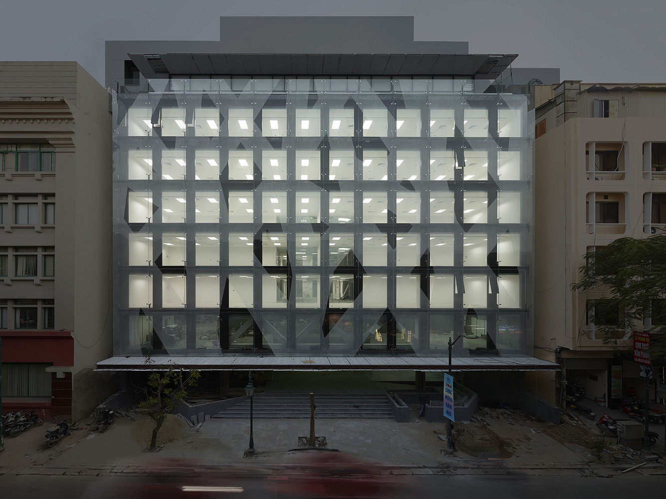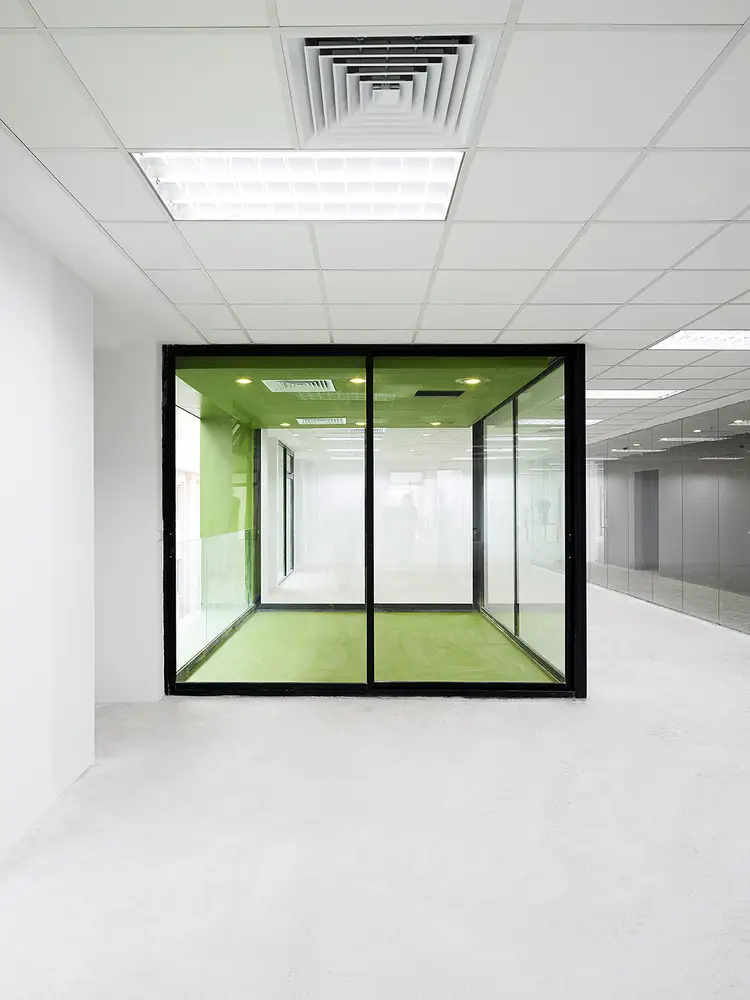 Mật độ các đường kẻ cho phép ánh sáng mặt trời chiếu xuyên suốt tòa nhà và mang lại sự riêng tư hơn cho không gian văn phòng. Lớp này giúp chắn tiếng ồn từ đường phố; tạo ra sự thông gió tự nhiên hiệu quả và bảo vệ tòa nhà khỏi mưa. Mặt tiền phía sau, đối mặt với bối cảnh hoàn toàn khác, được tạo thành từ các dãy cửa sổ và hành lang có mái che, tạo nên một mạng lưới giúp kiểm soát khoảng cách cực kỳ gần với tòa nhà kế bên. Các hành lang có mái che đóng vai trò như những khu vườn trong nhà; chúng mang lại sự “thư giãn” thực sự cho người sử dụng, đưa không gian bên ngoài vào trong và cung cấp sự thông gió tự nhiên cho không gian văn phòng.