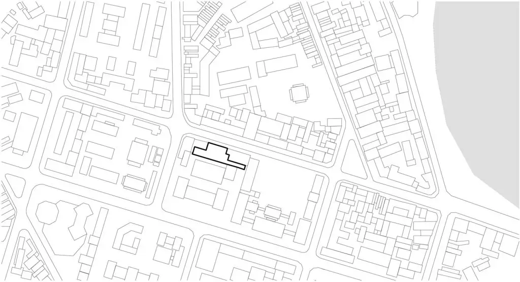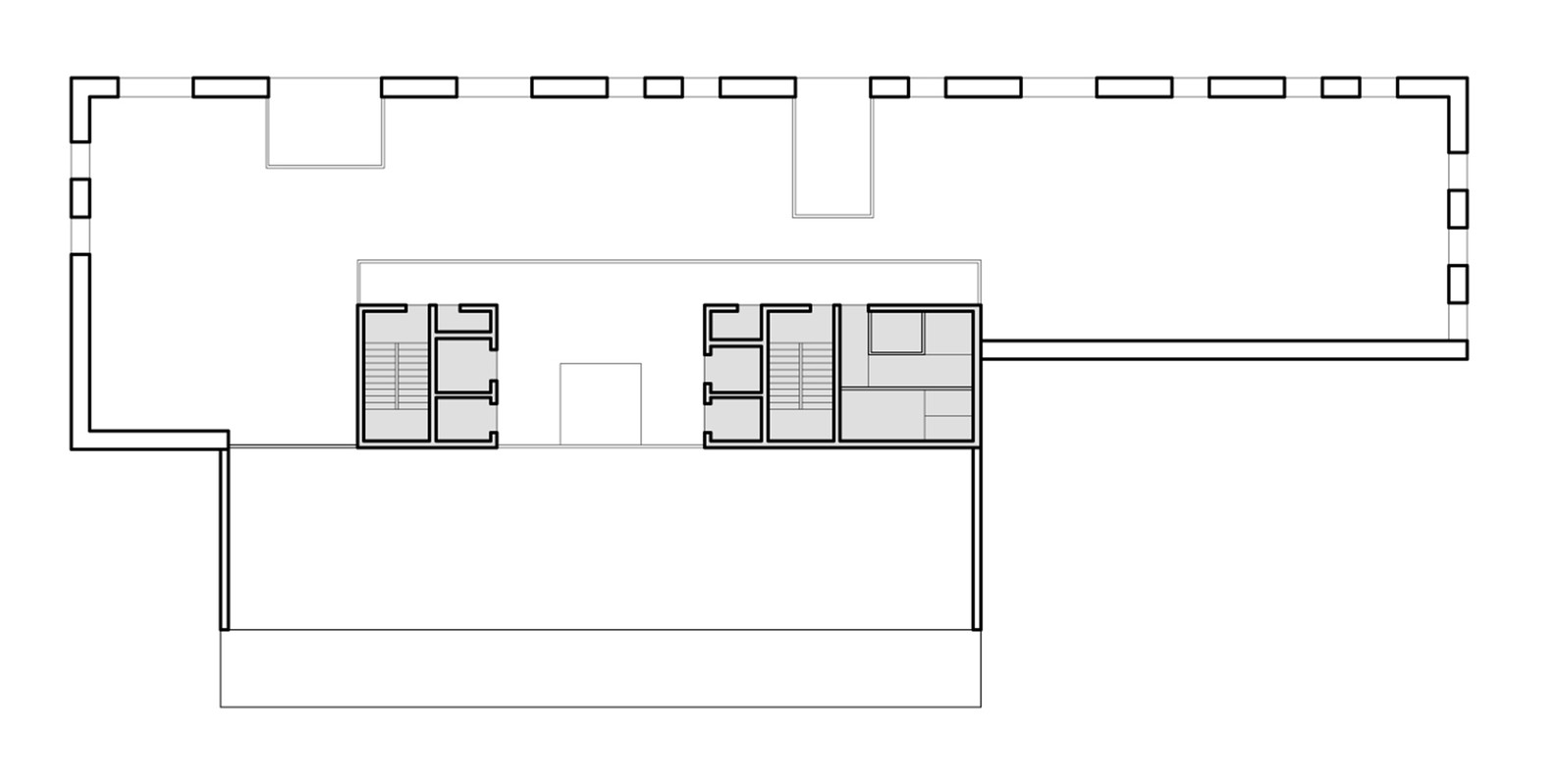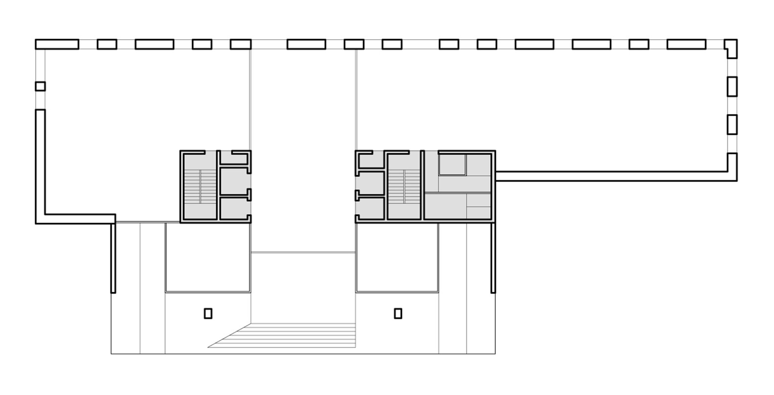 Mật độ các đường kẻ cho phép ánh sáng mặt trời chiếu xuyên suốt tòa nhà và mang lại sự riêng tư hơn cho không gian văn phòng. Lớp này giúp chắn tiếng ồn từ đường phố; tạo ra sự thông gió tự nhiên hiệu quả và bảo vệ tòa nhà khỏi mưa. Mặt tiền phía sau, đối mặt với bối cảnh hoàn toàn khác, được tạo thành từ các dãy cửa sổ và hành lang có mái che, tạo nên một mạng lưới giúp kiểm soát khoảng cách cực kỳ gần với tòa nhà kế bên. Các hành lang có mái che đóng vai trò như những khu vườn trong nhà; chúng mang lại sự “thư giãn” thực sự cho người sử dụng, đưa không gian bên ngoài vào trong và cung cấp sự thông gió tự nhiên cho không gian văn phòng.