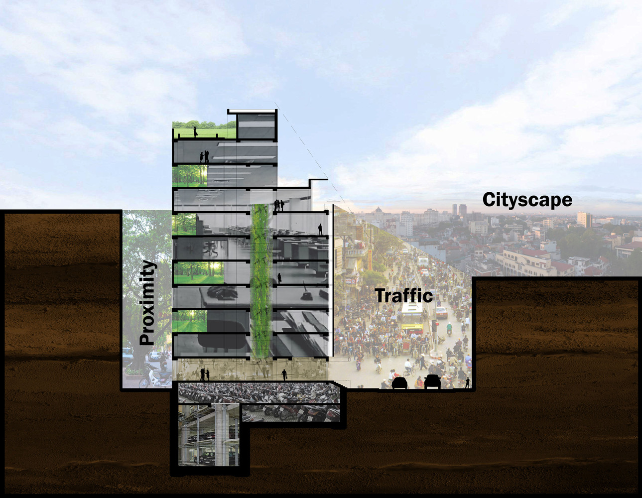 Để tạo ra một phương thức tổ chức văn phòng bền vững, mỗi tầng phải linh hoạt và được chia thành nhiều không gian văn phòng khác nhau với diện tích khác nhau. Bằng cách này, tòa nhà hẹp vẫn có thể cung cấp nhiều khu vực và không gian khác nhau. Mặt tiền được điều chỉnh phù hợp với các bối cảnh khác nhau của khu đất. Mặt tiền chính, tiếp xúc trực tiếp với đường phố, tạo nên bản sắc mạnh mẽ cho tòa nhà Coalimex và giải quyết được những hạn chế của nó. Mặt tiền này được làm bằng kính hai lớp. Trên lớp thứ hai, một họa tiết được in trên kính, thể hiện sự giao thoa giữa cây xanh trên đường phố Hà Nội và than đá (biểu tượng của chủ đầu tư).