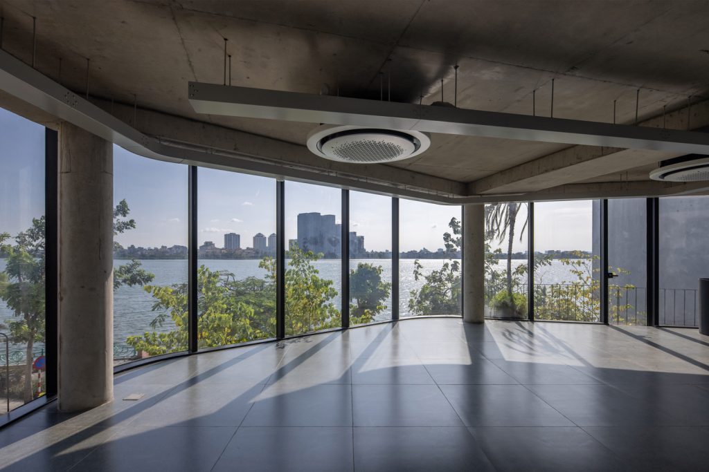 Chiến lược thiết kế cốt lõi là tính linh hoạt. Mỗi tầng được hình dung như một “không gian trống” mở, tận dụng tối đa cột trụ, không bị ràng buộc bởi các chức năng đã định trước. Điều này cho phép các khách thuê thứ cấp điều chỉnh không gian cho bất kỳ loại hình kinh doanh nào: quán cà phê, nhà hàng, phòng trưng bày, studio sáng tạo, văn phòng boutique, phòng triển lãm hoặc các chức năng kết hợp. Tòa nhà được thiết kế không chỉ dành cho một nhà điều hành duy nhất mà cho một vòng đời dài với nhiều khả năng thương mại đa dạng. Bên trong, sự kết hợp giữa các tấm bê tông lộ thiên và kính cường lực cao hết cỡ tạo nên một bầu không khí rộng rãi, thô mộc nhưng tinh tế. Các yếu tố kết cấu được tối thiểu hóa để bảo toàn tầm nhìn toàn cảnh hồ từ mọi tầng.