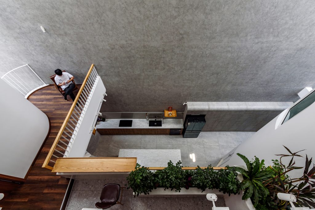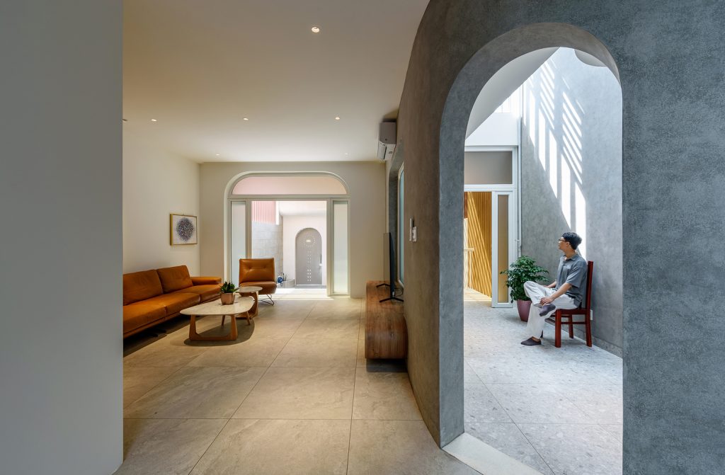 Mô tả thiết kế do kiến trúc sư cung cấp. Sau nhiều năm sống trong một căn hộ cao tầng sang trọng, chủ nhà nay đã già, mang nhiều kỷ niệm và cần sự kết nối với gia đình và hàng xóm hơn là các dịch vụ tiện ích. Vì vậy, chủ nhà đã trở về khu phố cũ, mua đất và xây nhà để có thể sống cùng các anh chị em ruột đang sống một mình. Thiết kế đáp ứng sự tiện nghi của các vật dụng nội thất chỉ giúp chủ nhà đáp ứng nhu cầu vật chất. Bởi vì chủ nhà cũng đã già và có nhu cầu tinh thần rất cao, tôi đã thiết kế và tập trung vào trải nghiệm không gian và ánh sáng để chủ nhà có thể cảm nhận rõ ràng hiện thực và đi sâu hơn vào nội tâm của mình.