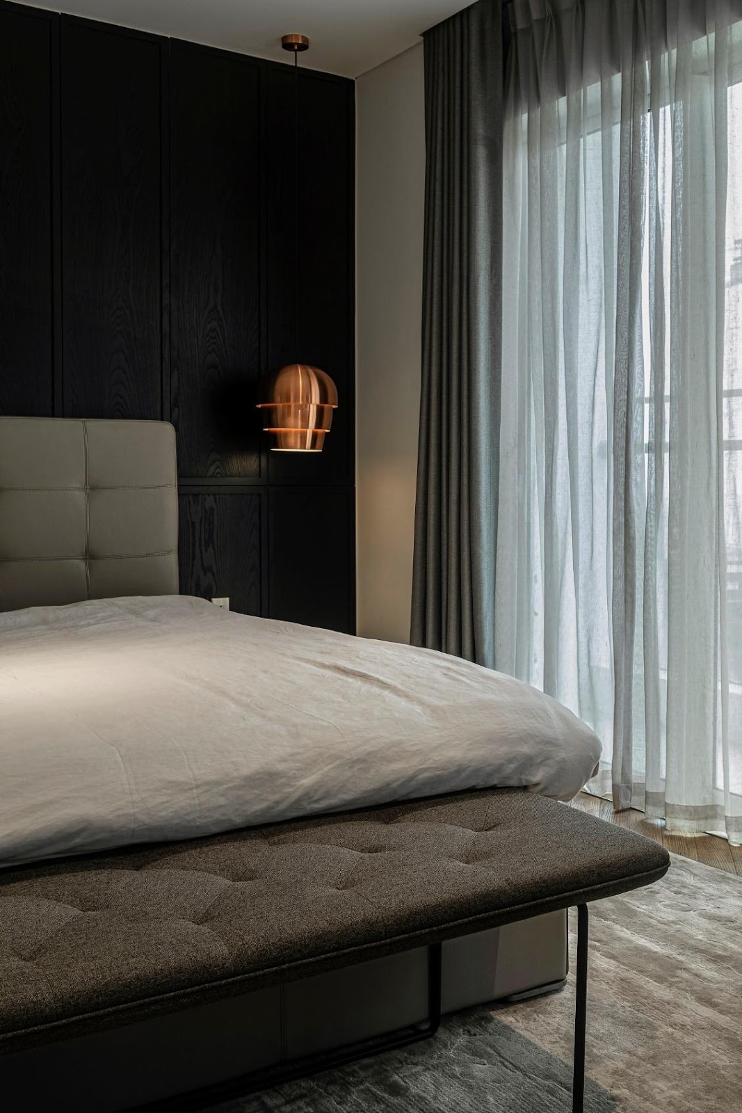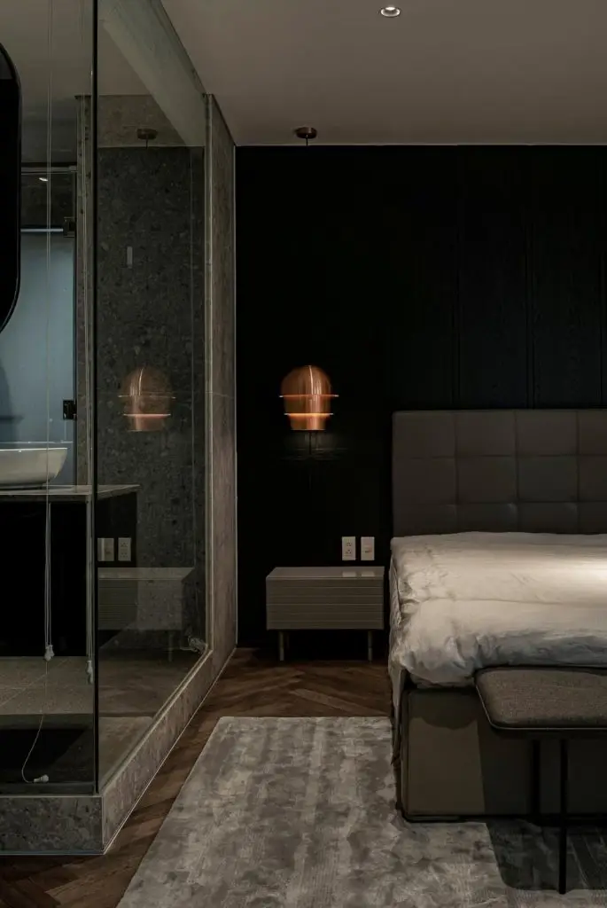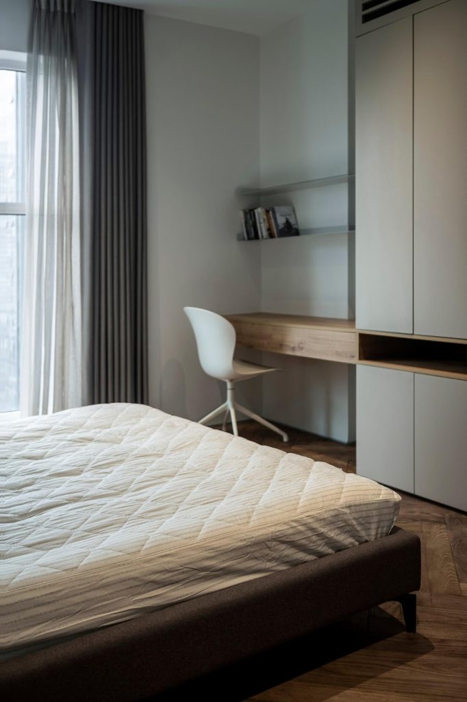 Phòng ngủ rộng rãi và thông thoáng. Đa phần các nội thất bên trong phòng đều sử dụng chất liệu gỗ công nghiệp và có tông màu trầm. Cùng với đó, sàn nhà phòng ngủ cũng được lát gỗ, mang đến không gian ấm áp và gần gũi.