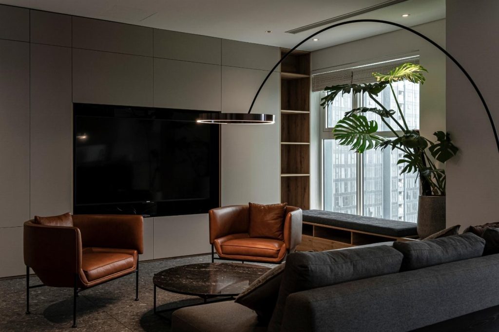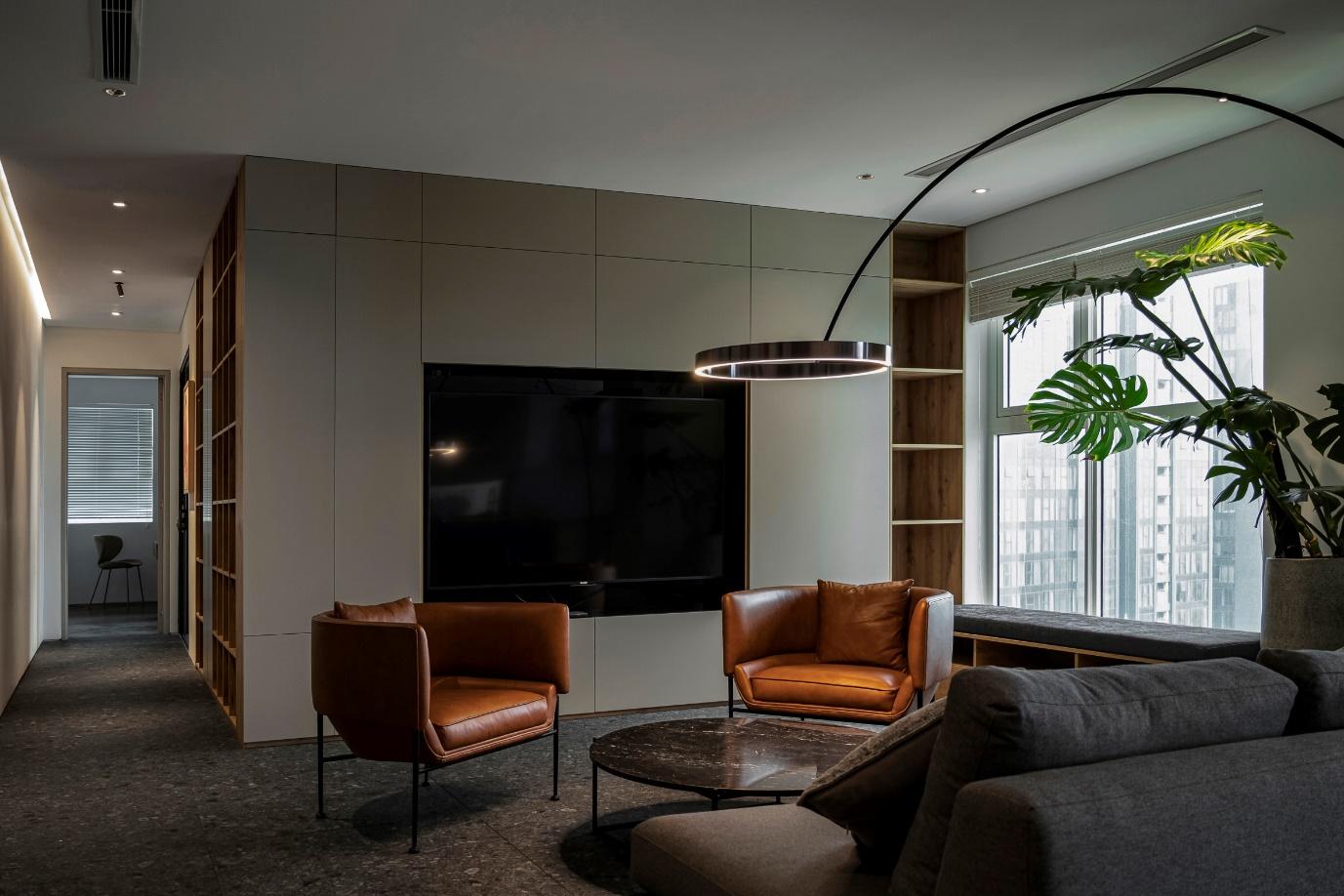 Để tiết kiệm không gian mặt sàn, khi thiết kế căn hộ hiện đại, đơn vị thiết kế đã lựa chọn tủ âm tường kết hợp với tivi treo. Khu vực tivi còn được tận dụng làm nơi đặt loa và có các ngăn tủ để chứa các vật dụng cần thiết. Ngoài ra, không gian phòng khách sử dụng hệ thống đèn led và điều hòa âm trần. Lối thiết kế này giúp căn phòng trở nên gọn gàng và thẩm mỹ hơn.