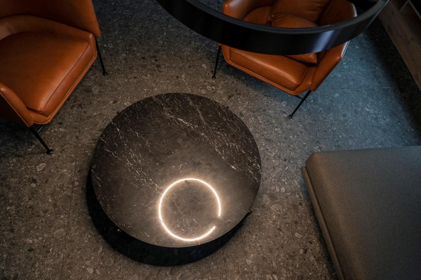 Phòng khách căn hộ được thiết kế đơn giản với ghế sofa, bàn tròn và hệ tủ âm tường kết hợp với tivi treo. Ghế sofa mang tông màu xám, vàng bò và có hình dáng khối tối giản. Kích thước chiều rộng của ghế sofa khá lớn, giúp mang lại cảm giác thoải mái và dễ chịu khi sử dụng. Nhóm thiết kế đã sử một chiếc bàn tròn có bề mặt bằng đá tự nhiên bền bỉ. Việc kết hợp đường cong của bàn cùng các góc cạnh vuông của ghế sofa giúp không gian trở nên cân đối hoàn hảo.