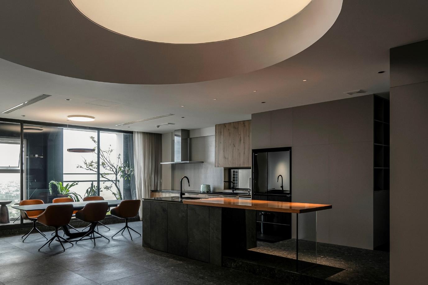 Khu vực bếp chính có dạng chữ I với đầy đủ các thiết bị bếp hiện đại và cần thiết. Ngoài ra, khu vực phòng bếp còn được thiết kế bàn đảo tiện lợi. NTK còn bố trí thêm khu vực tủ lạnh kết hợp tủ kho. Trần của căn hộ được thiết kế giật cấp kết hợp cùng hệ thống đèn vàng ấm áp tạo không gian thư giãn nhẹ nhàng, dễ chịu.
