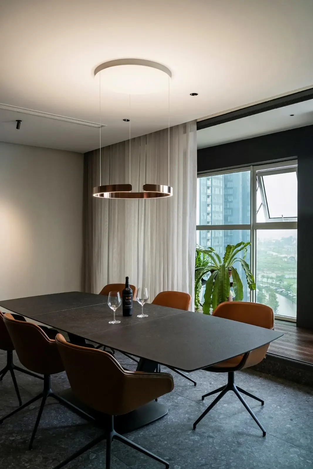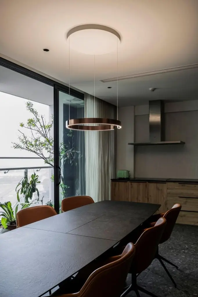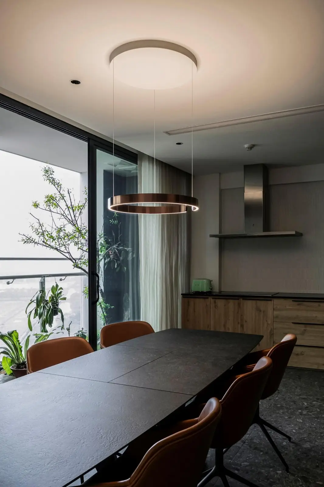 Khu vực bàn ăn được bố trí cạnh bếp. Bộ bàn ăn có kích thước vừa phải, được kết hợp từ hai chất liệu là gỗ và inox sơn tĩnh điện. Bàn ăn có thiết kế thông minh, dễ dàng gấp gọn hoặc mở rộng tuỳ vào mục đích sử dụng của gia chủ. Ghế bàn ăn được bọc đệm màu vàng bò mang đến sự êm ái và dễ chịu khi sử dụng.