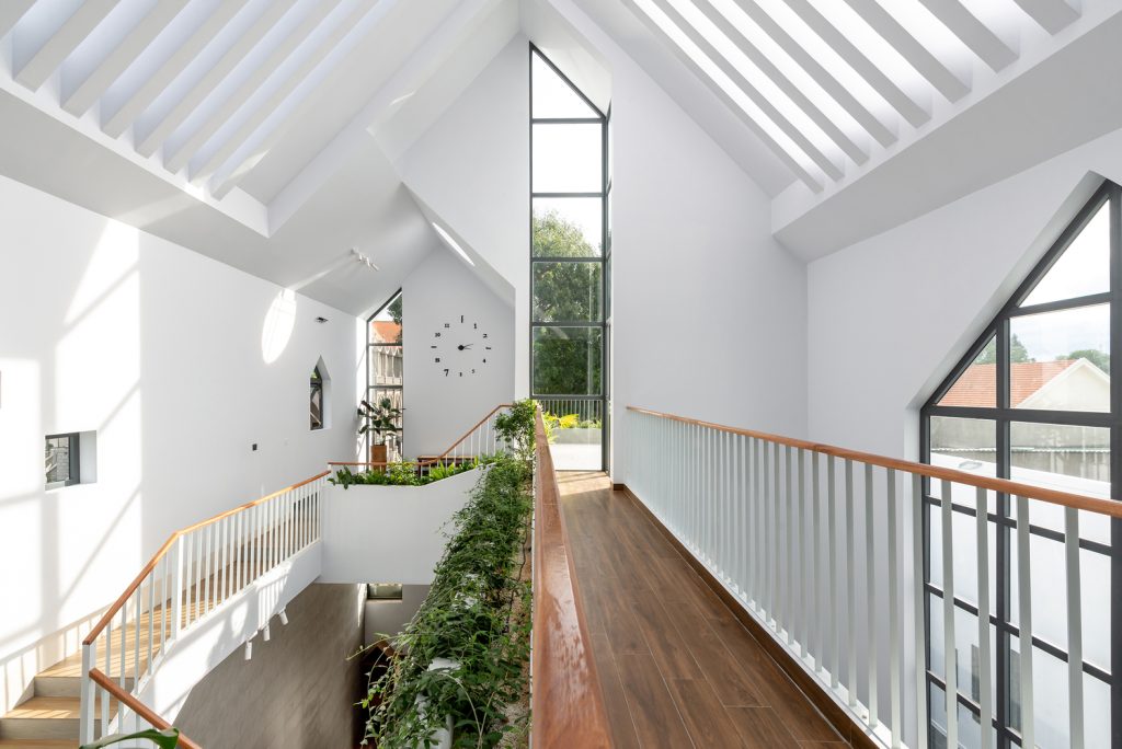 Phía sau là không gian dự kiến được phát triển thành phòng trưng bày kỷ vật gia đình và khu vực phơi đồ. Phần mái ở giữa nhà được làm bằng các thanh bê tông kết hợp với mái kính để đón ánh sáng tự nhiên, mang đậm tinh thần gia đình Công giáo. Khi Chúa tạo dựng thế giới này, Ngài đã tạo ra ánh sáng. Vì vậy, ánh sáng tự nhiên rất quan trọng, việc bố trí nhiều ô cửa ở các vị trí khác nhau kết hợp với mái kính ở giữa nhà tạo ra nhiều tia sáng xen kẽ trên tường, làm cho không gian trở nên thú vị. Các cửa sổ mái và mặt tiền có thiết kế hình chóp để phù hợp với hình dạng của nhà thờ gần đó, tạo nên một tổng thể hài hòa ở bên ngoài, trong khi nội thất được thiết kế đơn giản và trực quan. Sử dụng ánh sáng tự nhiên làm điểm nhấn, ánh sáng sẽ thay đổi mỗi giờ để chúng ta không cảm thấy nhàm chán.