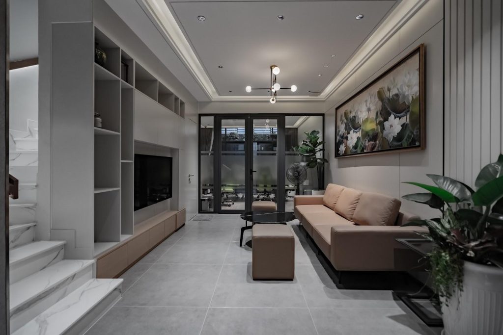 Tầng trệt của H House đã được thiết kế và sử dụng làm văn phòng tại nhà, nơi có không gian riêng biệt cho phòng tiếp khách, tạo ra một môi trường làm việc chuyên nghiệp và hiện đại. Điều này không chỉ mang lại sự thoải mái cho công việc hàng ngày mà còn tạo nên một không gian đón khách ấn tượng và chuyên nghiệp.