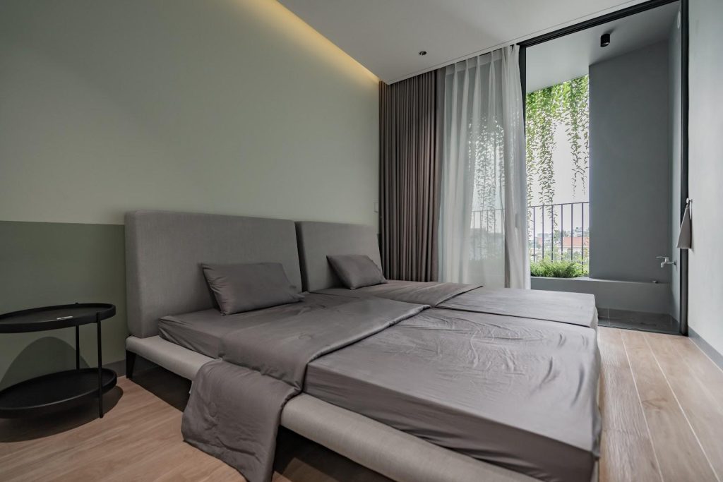 Màu sắc chủ đạo trong phòng ngủ là những gam màu trung tính như trắng, xám,… tạo nên không gian thanh lịch và hiện đại. Ánh sáng tự nhiên được tận dụng tối đa thông qua cửa sổ lớn, giúp làm sáng không gian và tạo cảm giác thoải mái. Không những thế, việc bố trí mảng xanh ở khu vực ban công của phòng ngủ giúp mang đến bầu không khí tươi mới và thoải mái.