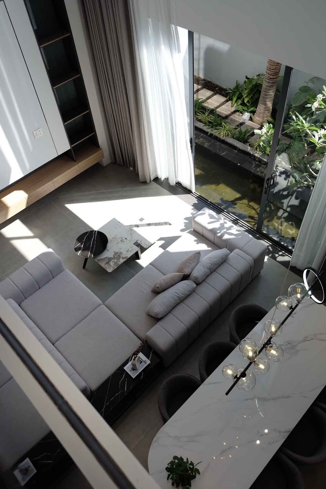 Phòng khách tại H Villa có thiết kế sang trọng và hiện đại, nổi bật với tone màu xám trung tính