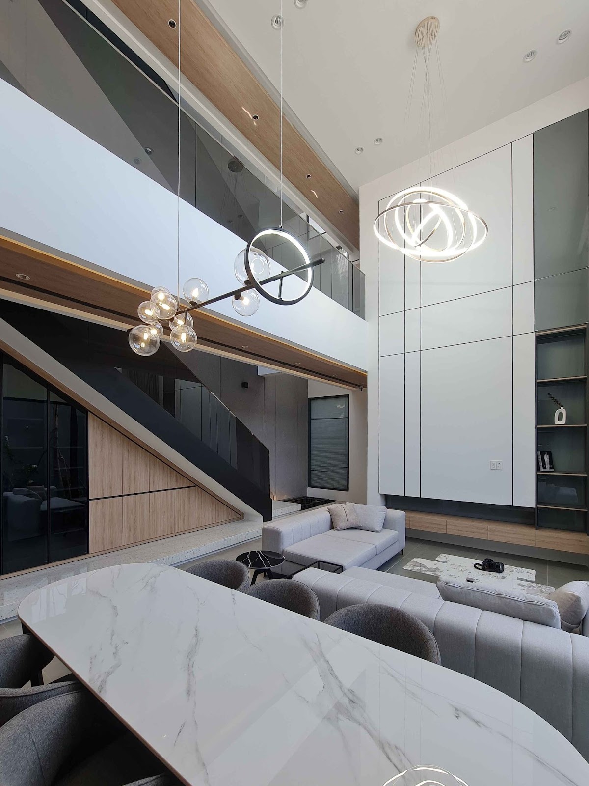 Phòng khách tại H Villa toát lên vẻ đẹp sang trọng và hiện đại, nổi bật với tone màu xám. Màu xám không chỉ tạo nên sự đẳng cấp mà còn làm nổi bật vẻ đẹp tinh tế của từng chi tiết trong không gian.