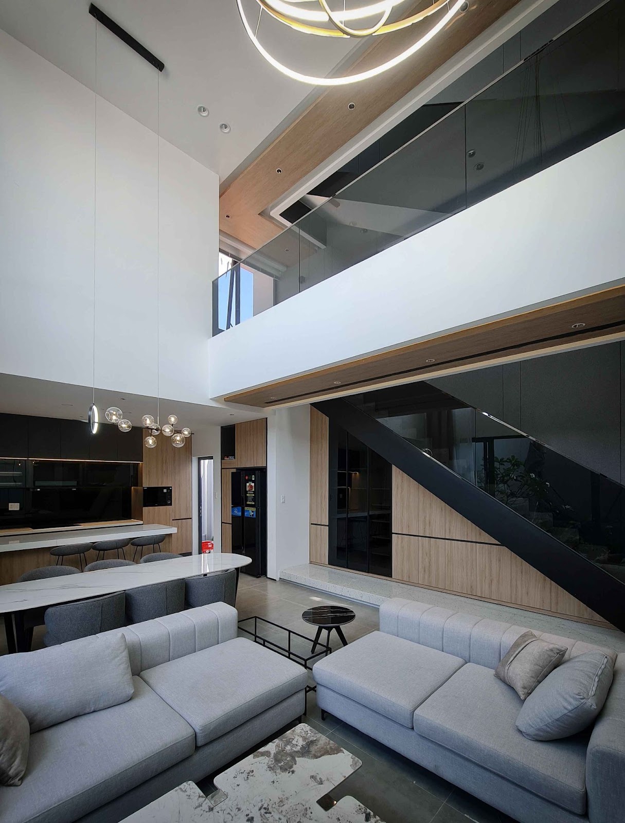 Phòng khách và phòng ăn liền kề nhau tạo nên một không gian chức năng hài hòa. Đây là nơi mọi thành viên trong gia đình có thể tận hưởng những khoảnh khắc ấm áp và thoải mái  trò chuyện, cùng nhau tạo nên bầu không khí của gia đình.