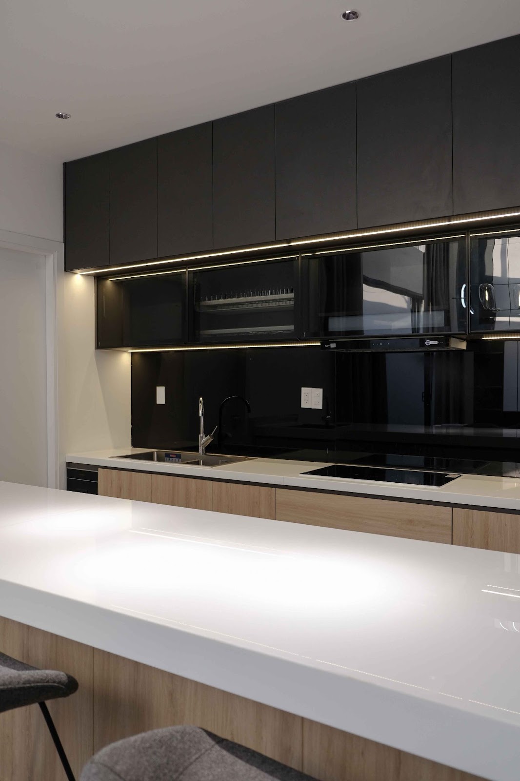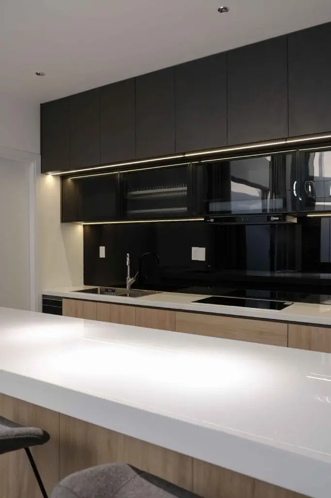 Bếp được trang bị đầy đủ các thiết bị hiện đại như bếp từ, lò nướng, và máy hút mùi tiện ích. Mọi chi tiết từ bếp nấu đến bồn rửa đều được tích hợp một cách hài hòa, tạo nên không gian hiện đại và đầy tiện nghi