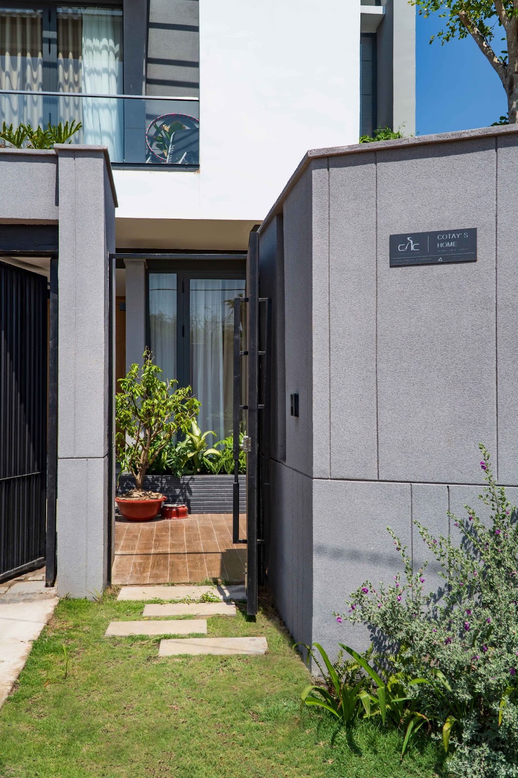 Để tạo nên nét đẹp tinh tế ngay từ bên ngoài vào, các kiến trúc sư đã sử dụng kỹ thuật sơn phun giả đá tại cổng ra vào