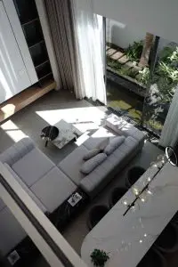 Bên cạnh đó việc kết hợp khéo léo giữa không gian nội thất và ngoại thất là một trong những điểm nhấn làm nổi bật không gian sống. Cửa kính lớn giúp kết nối với cảnh đẹp bên ngoài, tạo cảm giác như không gian mở rộng và thông thoáng hơn. Khung cảnh hồ nước và mảng xanh bên ngoài không chỉ làm cho không gian trở nên sinh động mà còn tạo nên một không gian yên bình và thư thái.