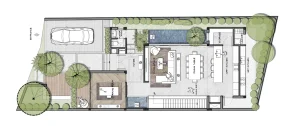 Bố cục tổng thể của H Villa được bố trí một cách hợp lý và tinh tế, đảm bảo tính tiện nghi và thoải mái cho gia chủ. Bên ngoài căn biệt thự, các mảng xanh được bố trí một cách khéo léo tạo nên nhiều không gian xanh, trong lành và mát mẻ giúp làm dịu mát không khí, giảm thiểu tiếng ồn và đối lưu không khí trong nhà.
