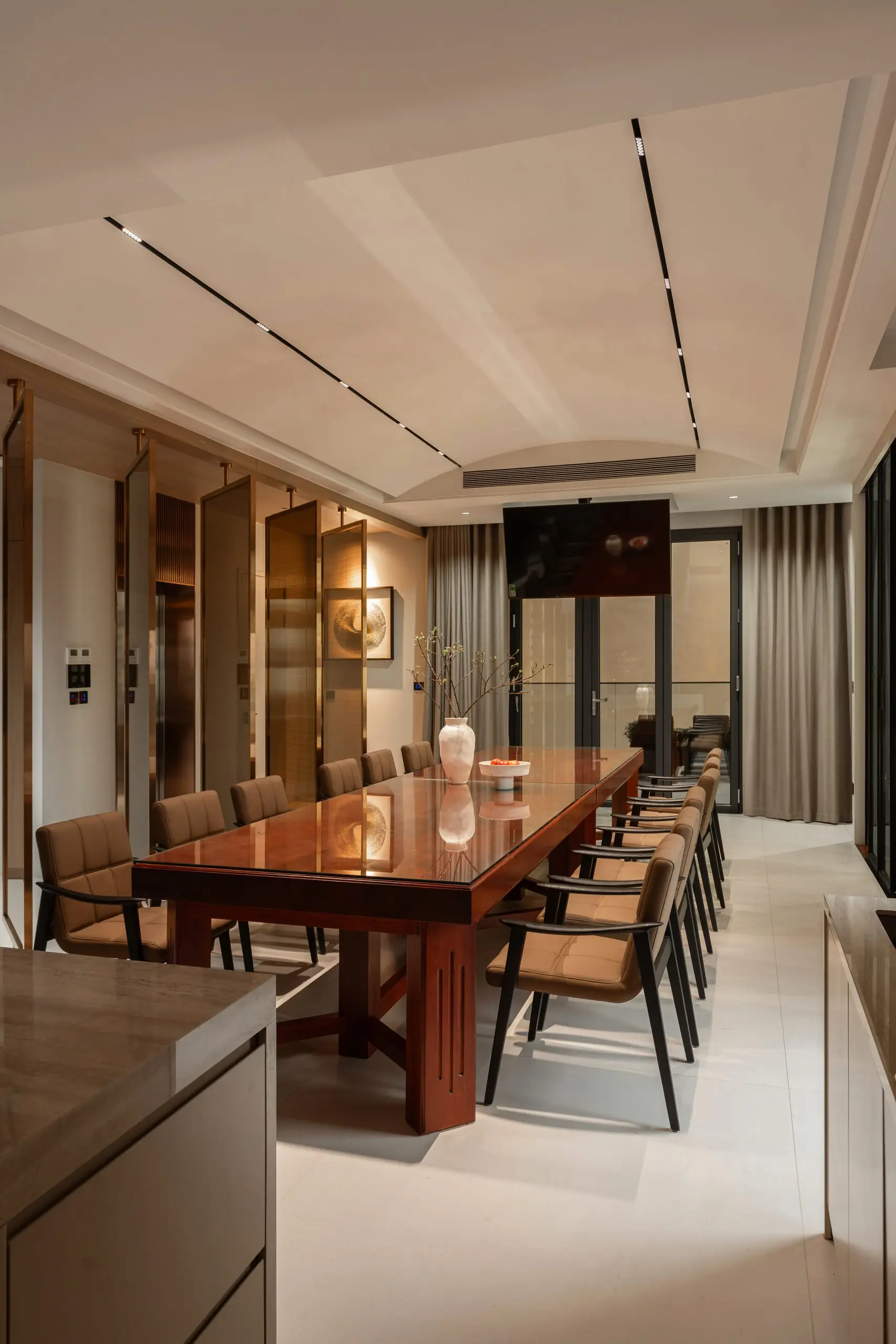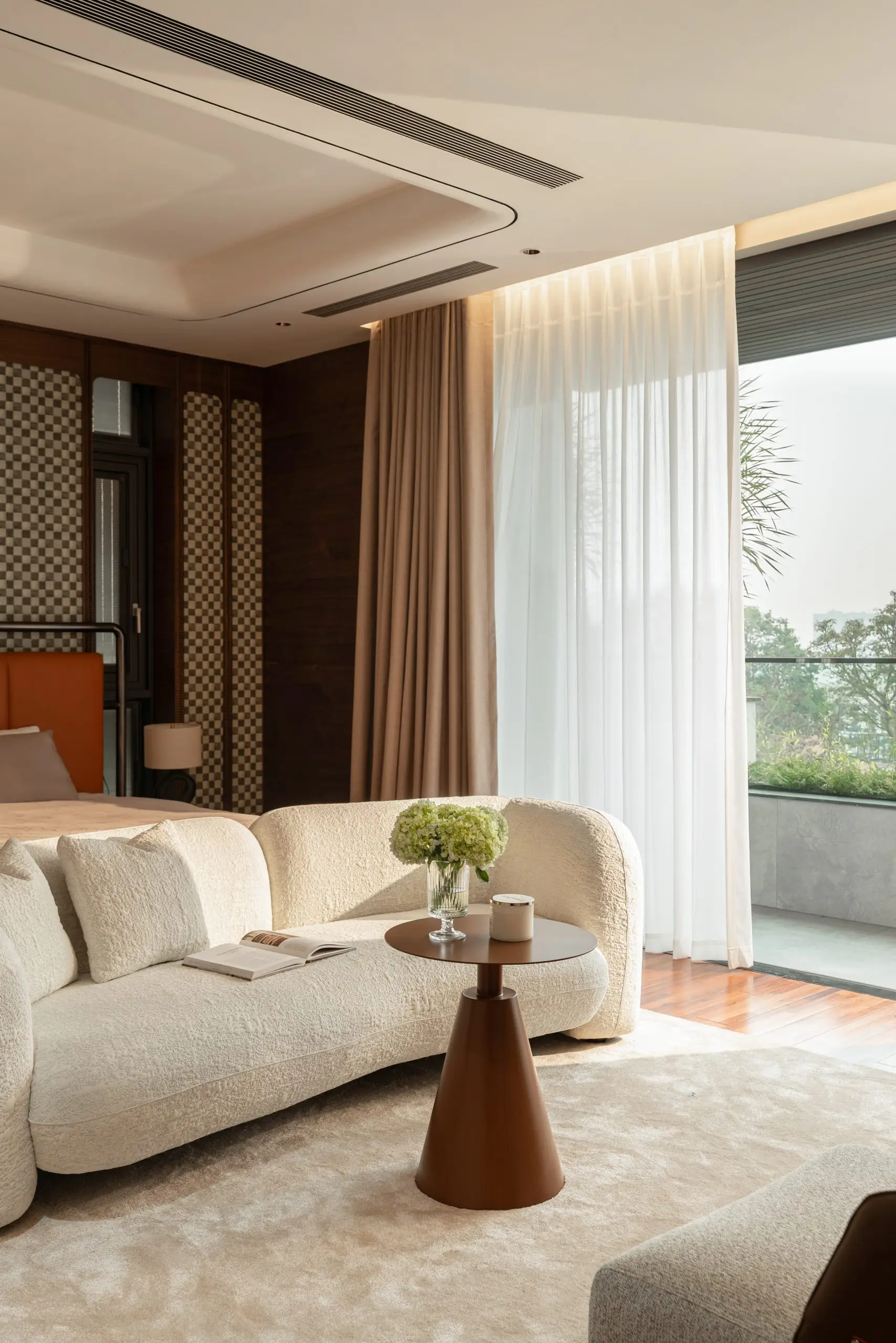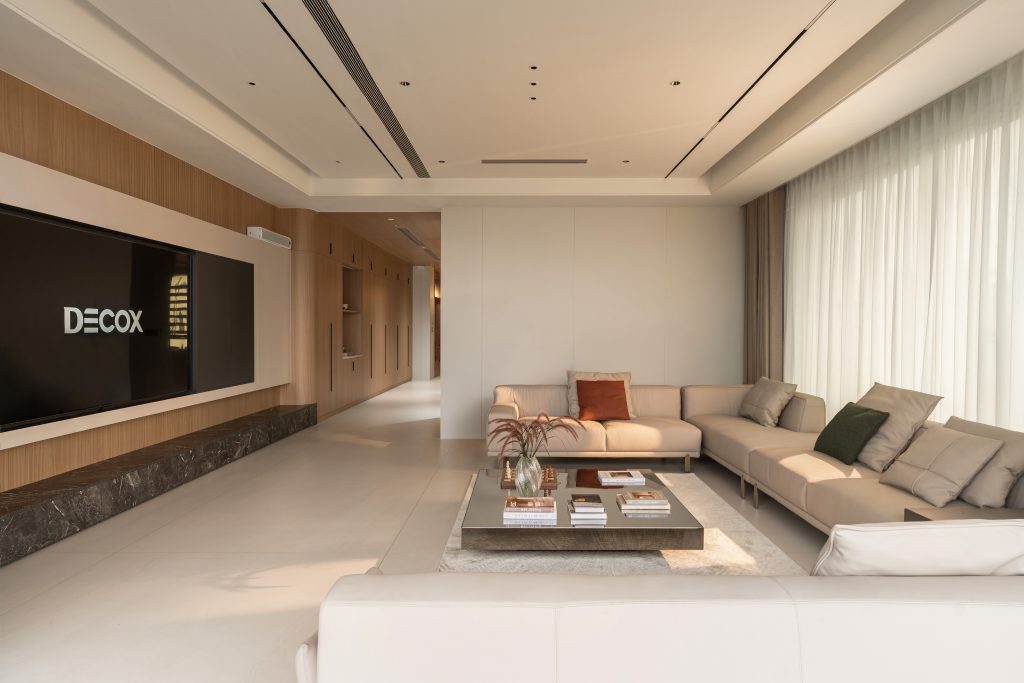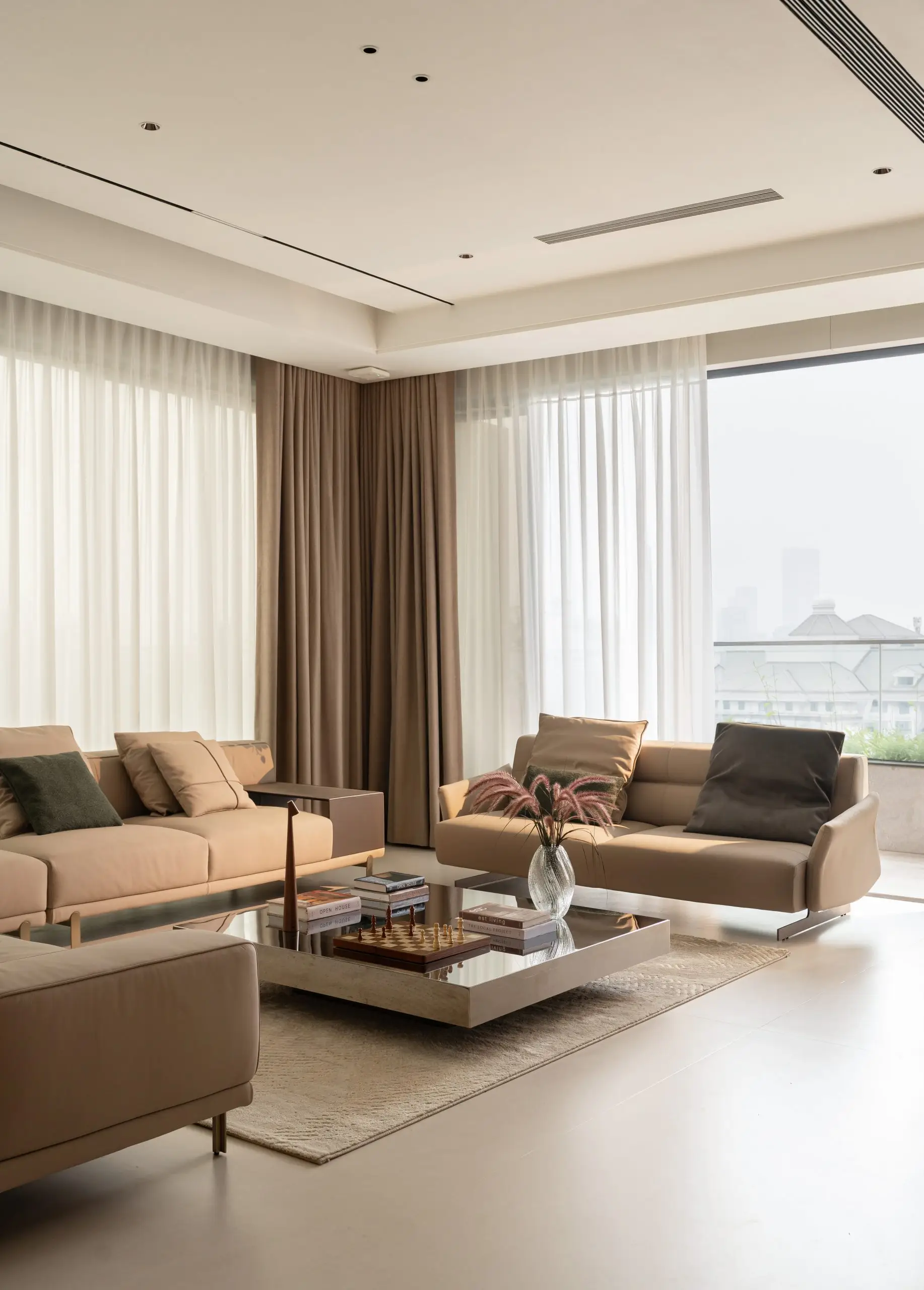 Khu vực phòng khách được thiết kế với bố cục đối xứng và hệ sofa lớn, tạo nên không gian sinh hoạt chung rộng rãi, phù hợp cho những buổi sum họp gia đình hoặc tiếp đón khách. Ánh sáng tự nhiên được tận dụng tối đa thông qua hệ cửa kính lớn, kết hợp cùng rèm hai lớp giúp điều tiết ánh sáng, mang lại cảm giác nhẹ nhàng và thư giãn cho toàn bộ không gian.