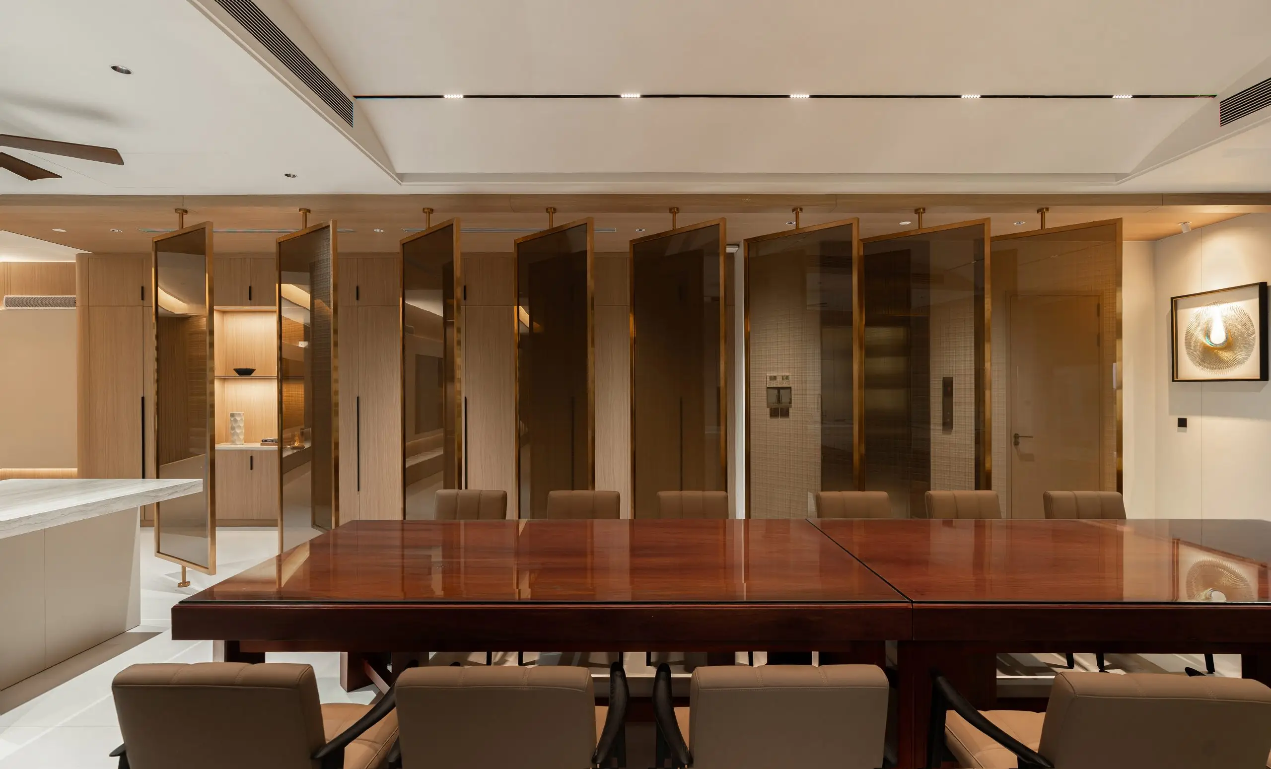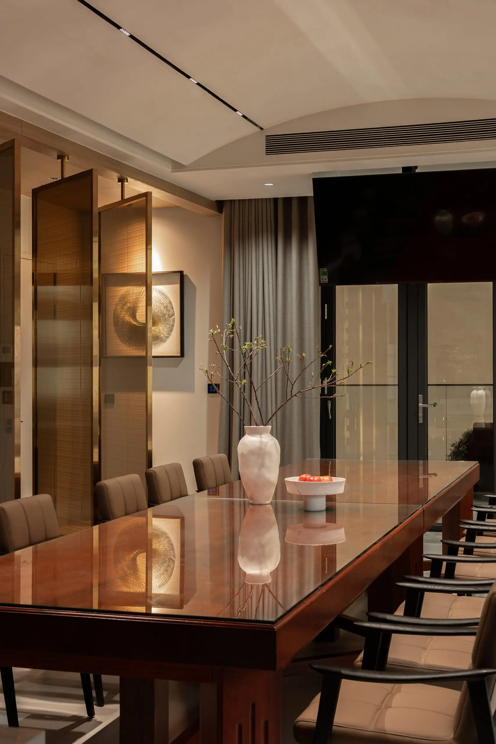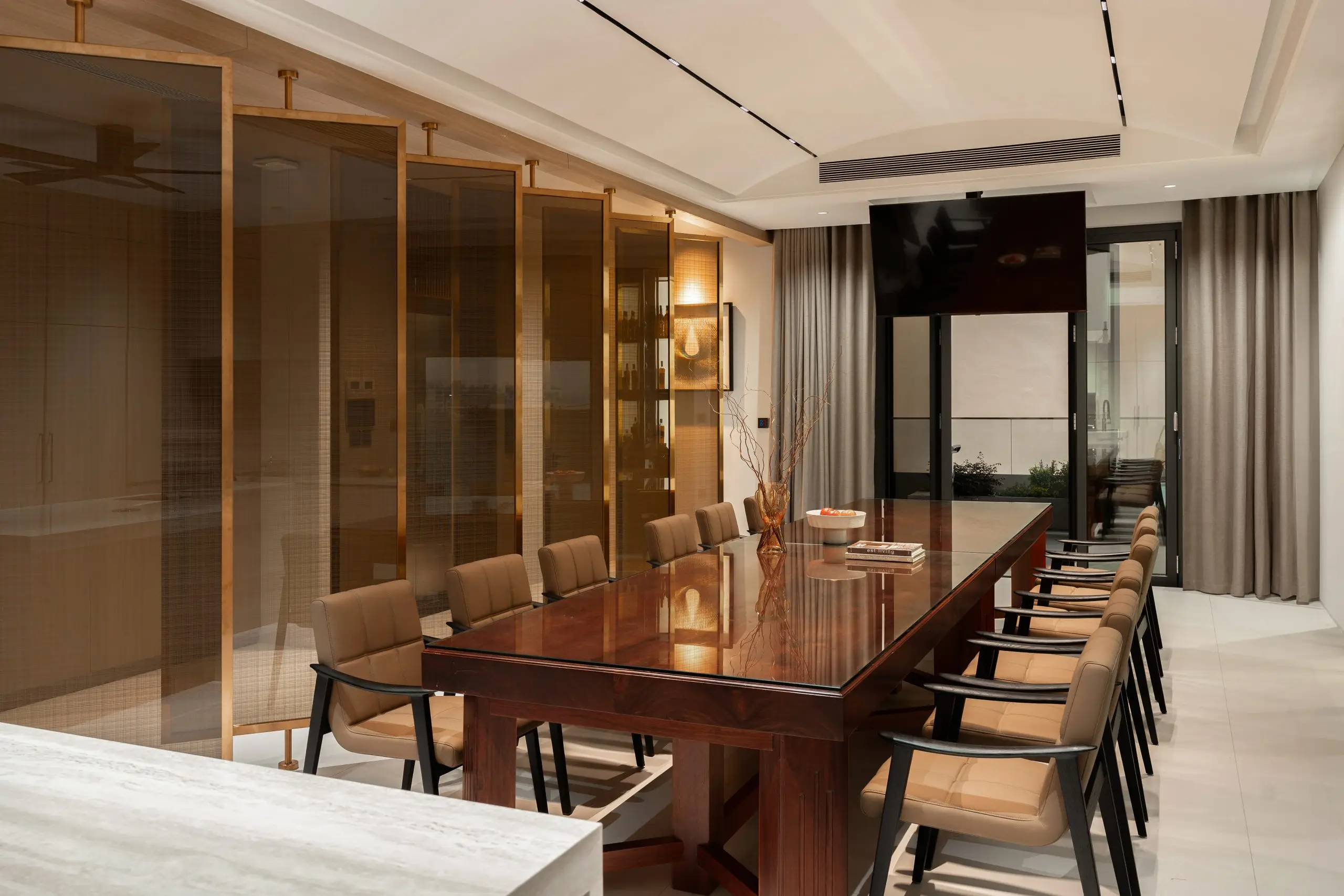 Khu vực phòng khách được thiết kế với bố cục đối xứng và hệ sofa lớn, tạo nên không gian sinh hoạt chung rộng rãi, phù hợp cho những buổi sum họp gia đình hoặc tiếp đón khách. Ánh sáng tự nhiên được tận dụng tối đa thông qua hệ cửa kính lớn, kết hợp cùng rèm hai lớp giúp điều tiết ánh sáng, mang lại cảm giác nhẹ nhàng và thư giãn cho toàn bộ không gian.