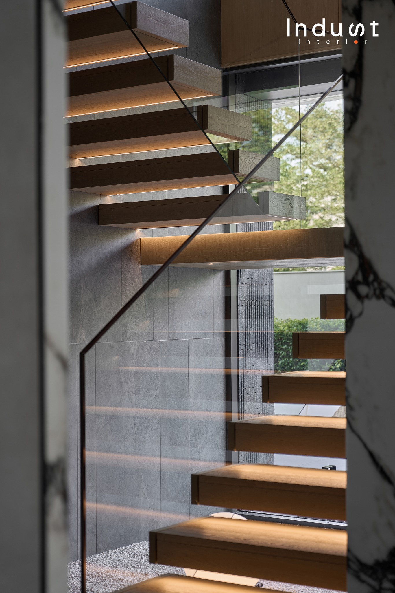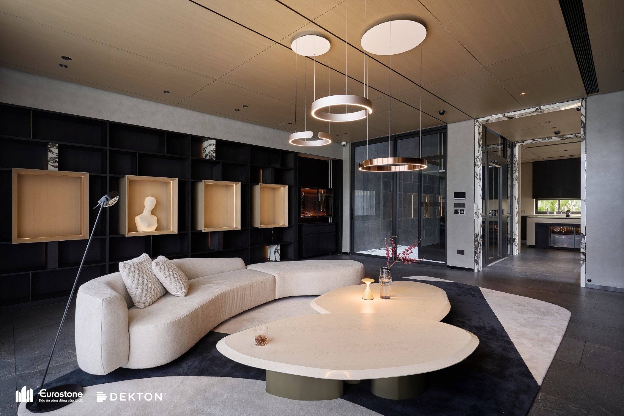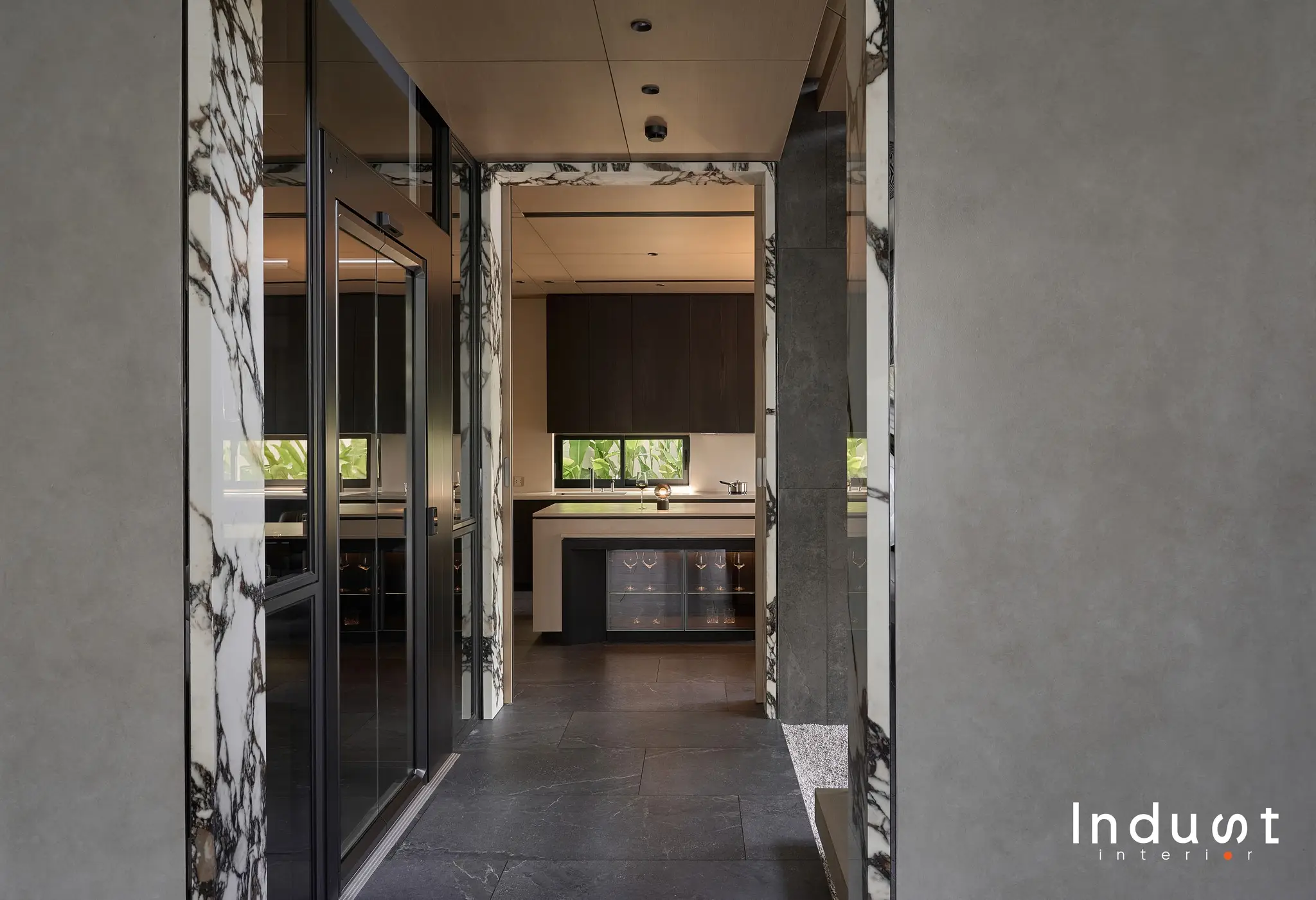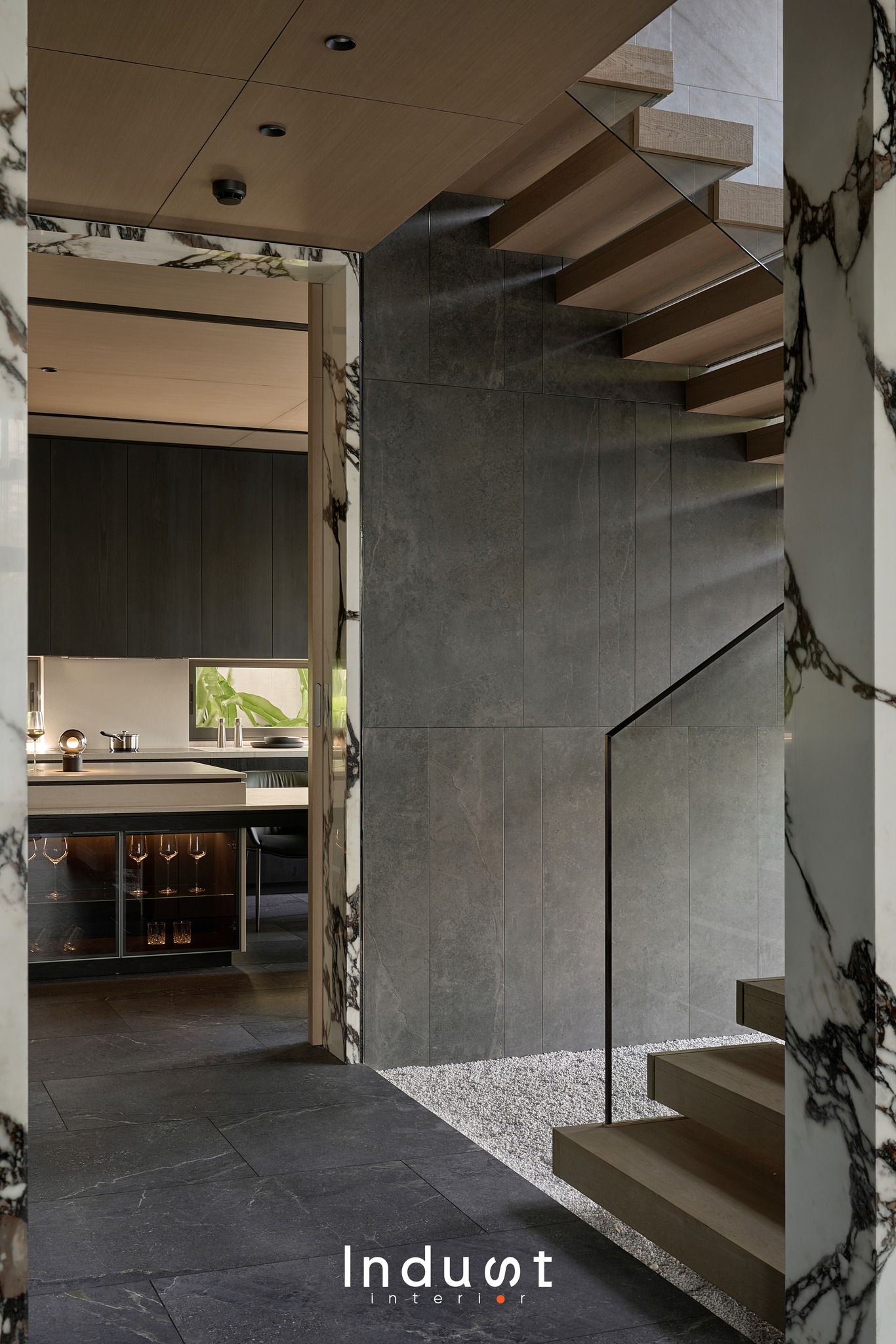 Tổ hợp khách – bếp được mở hoàn toàn về mặt thị giác, nhưng lại không bị hoà tan. Giữa hai không gian này là một lớp chuyển nhẹ, sảnh thang đóng vai trò như một “nút thắt mềm” về không gian. Khung bao cửa bằng đá cẩm thạch được đặt như một khung cảnh có chủ ý, nơi ánh sáng tràn qua cầu thang kính lớn và được dẫn dắt bằng nhịp trần ốp gỗ xuyên suốt. Cảm giác phân vùng được gợi nhẹ không rõ ranh giới, nhưng vẫn có nhịp điệu, cho phép hai không gian vừa kết nối vừa tách biệt trong một sự linh hoạt đầy chủ đích.