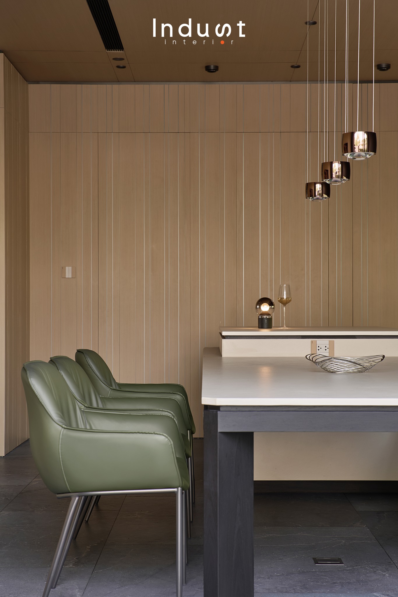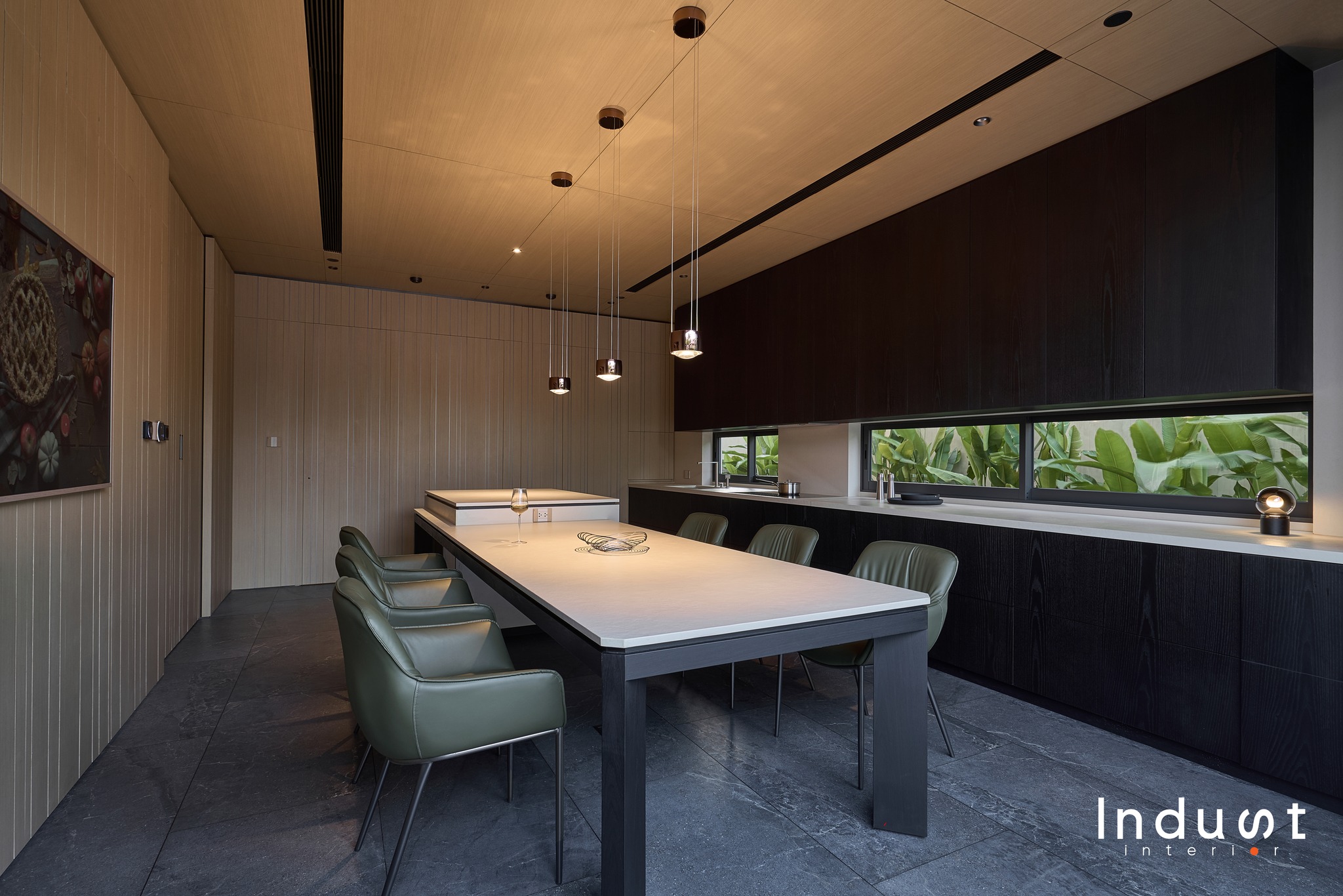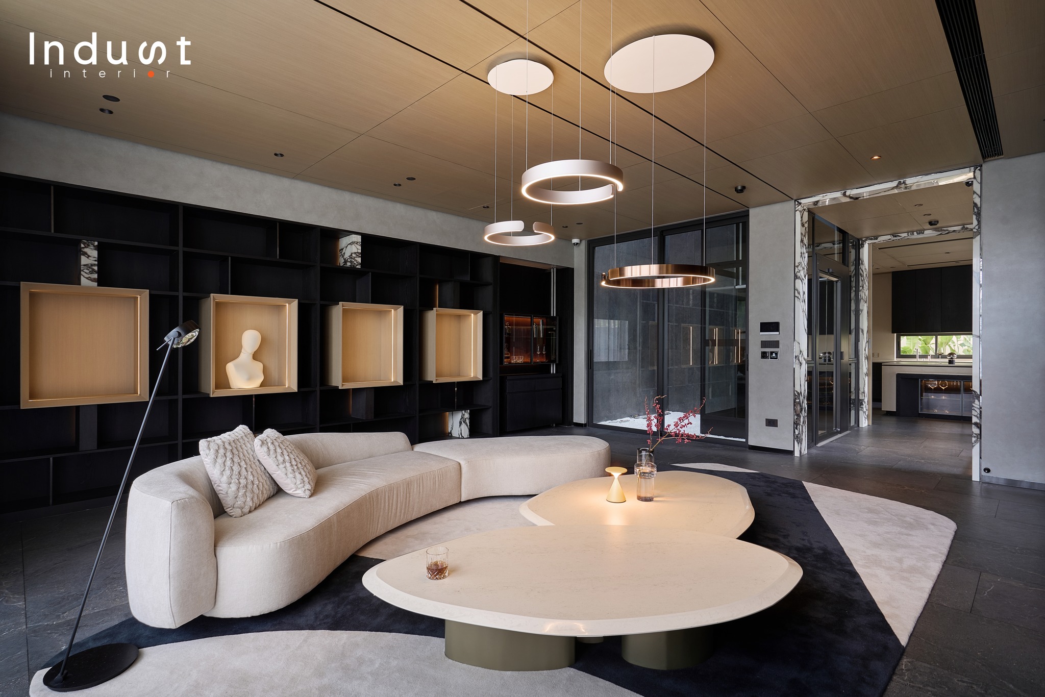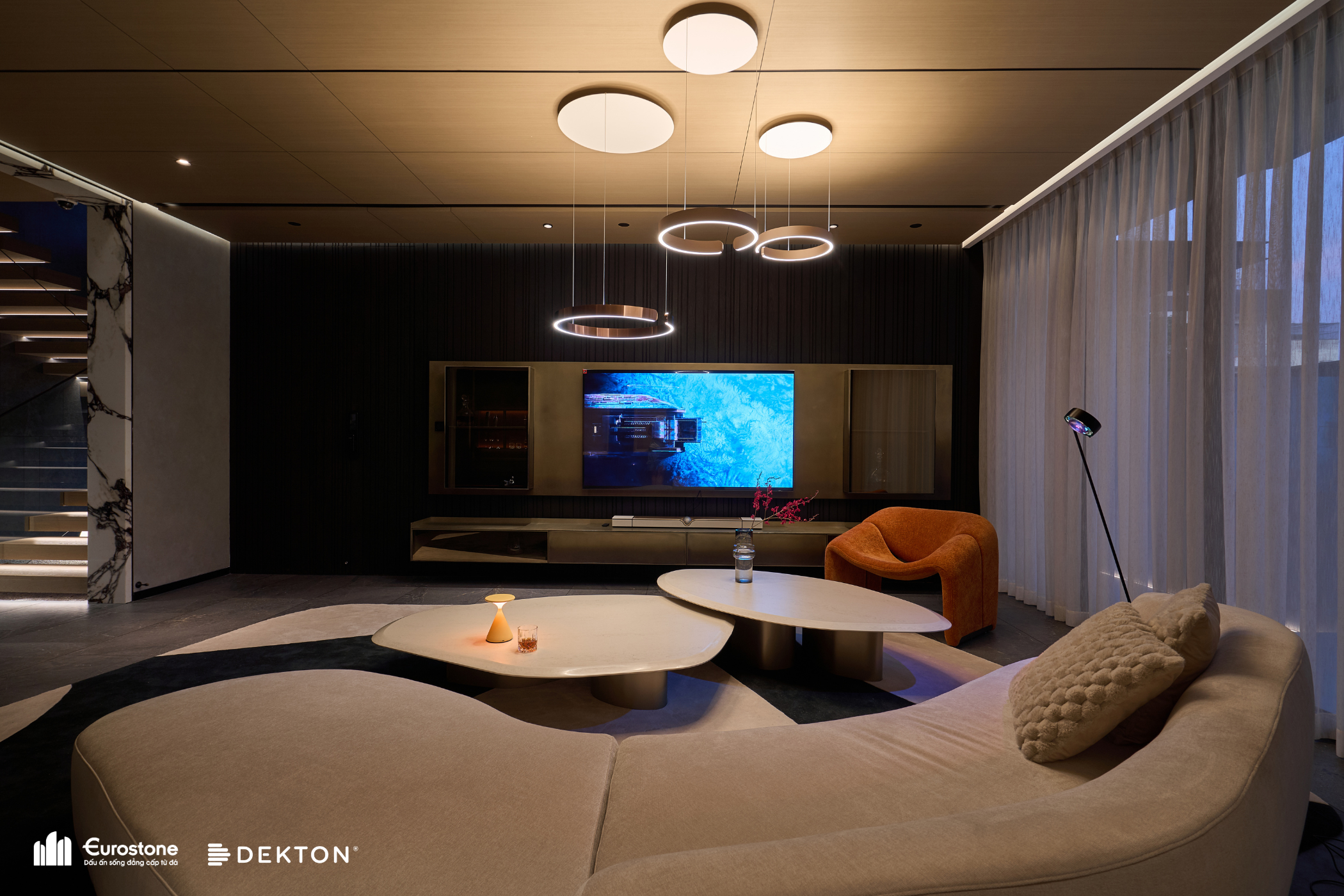 Tổ hợp khách – bếp được mở hoàn toàn về mặt thị giác, nhưng lại không bị hoà tan. Giữa hai không gian này là một lớp chuyển nhẹ, sảnh thang đóng vai trò như một “nút thắt mềm” về không gian. Khung bao cửa bằng đá cẩm thạch được đặt như một khung cảnh có chủ ý, nơi ánh sáng tràn qua cầu thang kính lớn và được dẫn dắt bằng nhịp trần ốp gỗ xuyên suốt. Cảm giác phân vùng được gợi nhẹ không rõ ranh giới, nhưng vẫn có nhịp điệu, cho phép hai không gian vừa kết nối vừa tách biệt trong một sự linh hoạt đầy chủ đích.