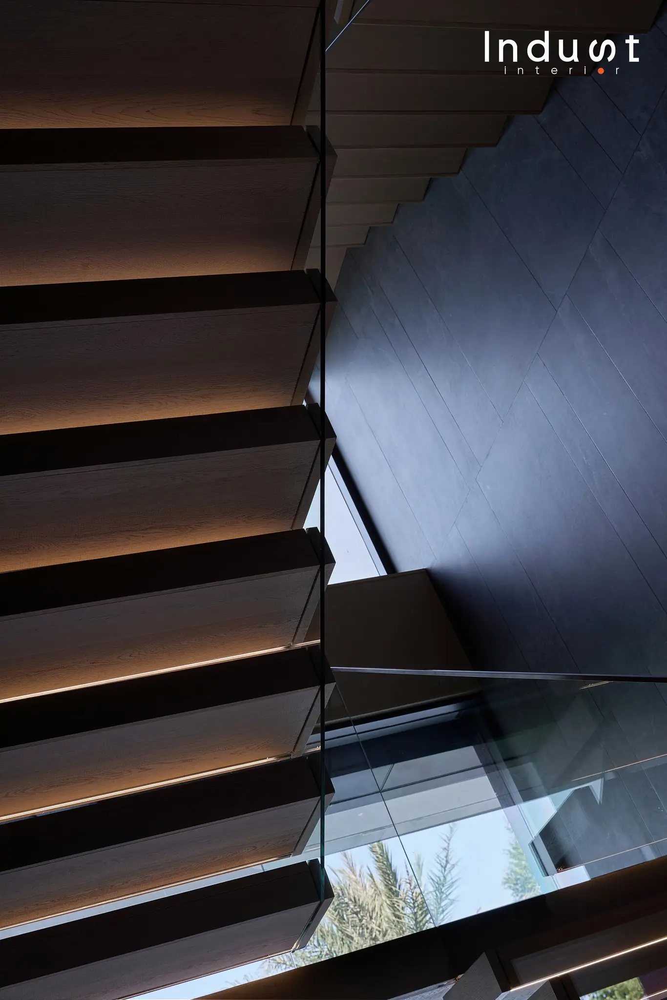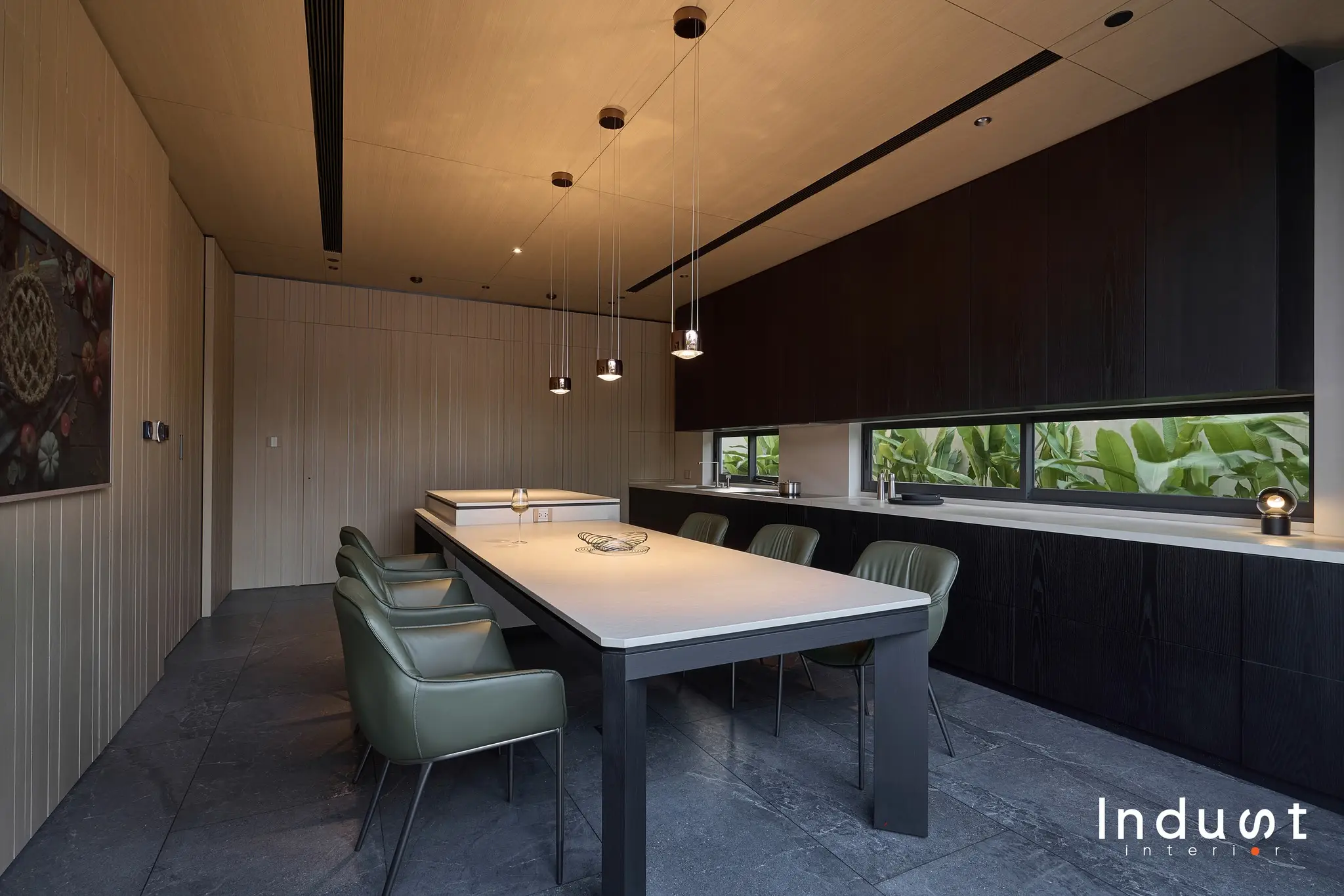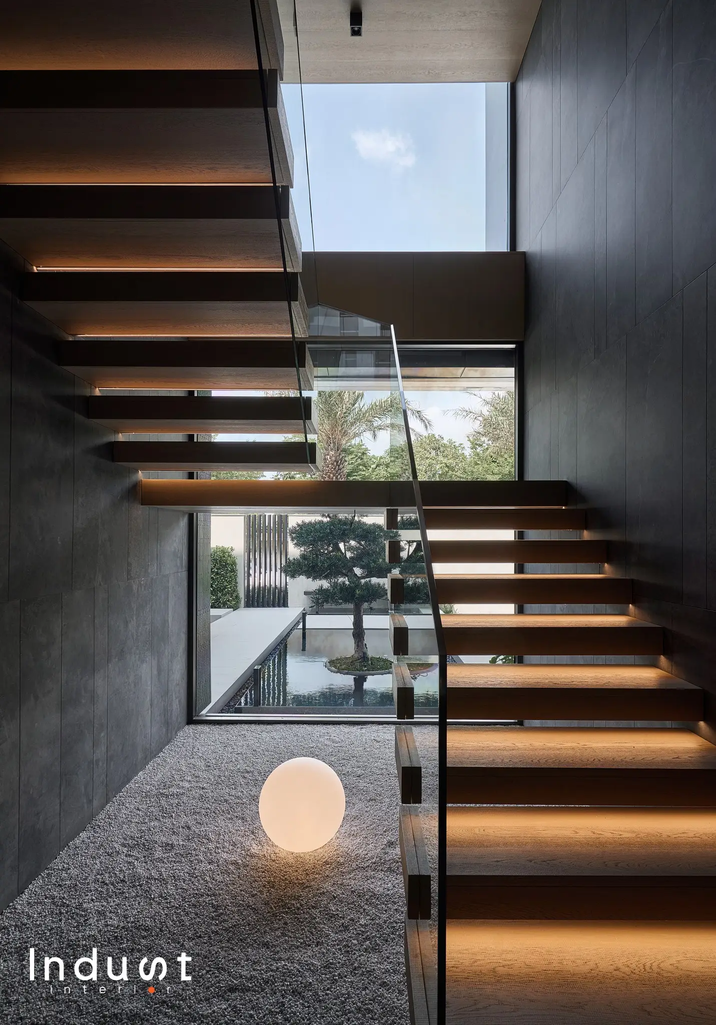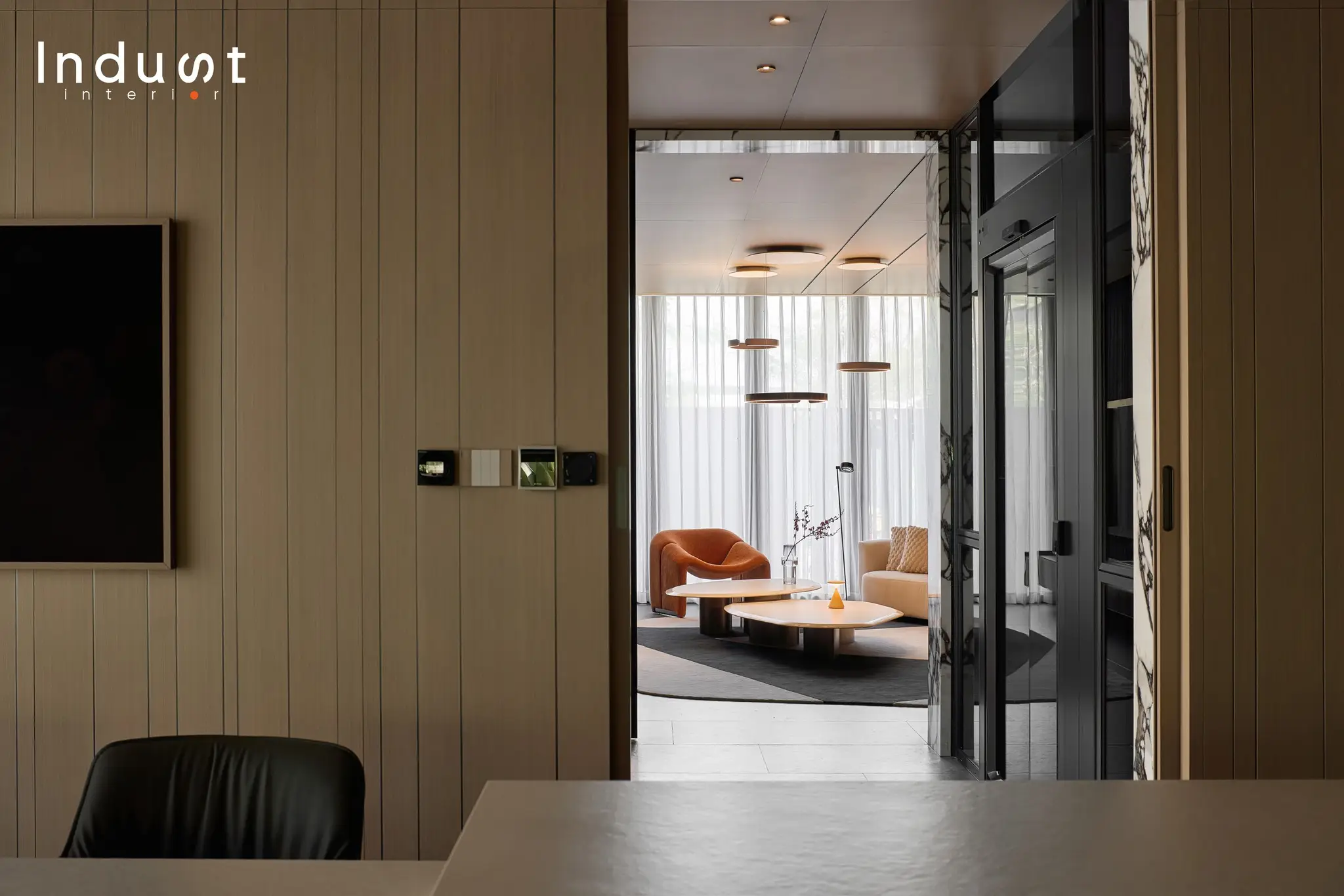 Tổ hợp khách – bếp được mở hoàn toàn về mặt thị giác, nhưng lại không bị hoà tan. Giữa hai không gian này là một lớp chuyển nhẹ, sảnh thang đóng vai trò như một “nút thắt mềm” về không gian. Khung bao cửa bằng đá cẩm thạch được đặt như một khung cảnh có chủ ý, nơi ánh sáng tràn qua cầu thang kính lớn và được dẫn dắt bằng nhịp trần ốp gỗ xuyên suốt. Cảm giác phân vùng được gợi nhẹ không rõ ranh giới, nhưng vẫn có nhịp điệu, cho phép hai không gian vừa kết nối vừa tách biệt trong một sự linh hoạt đầy chủ đích.
