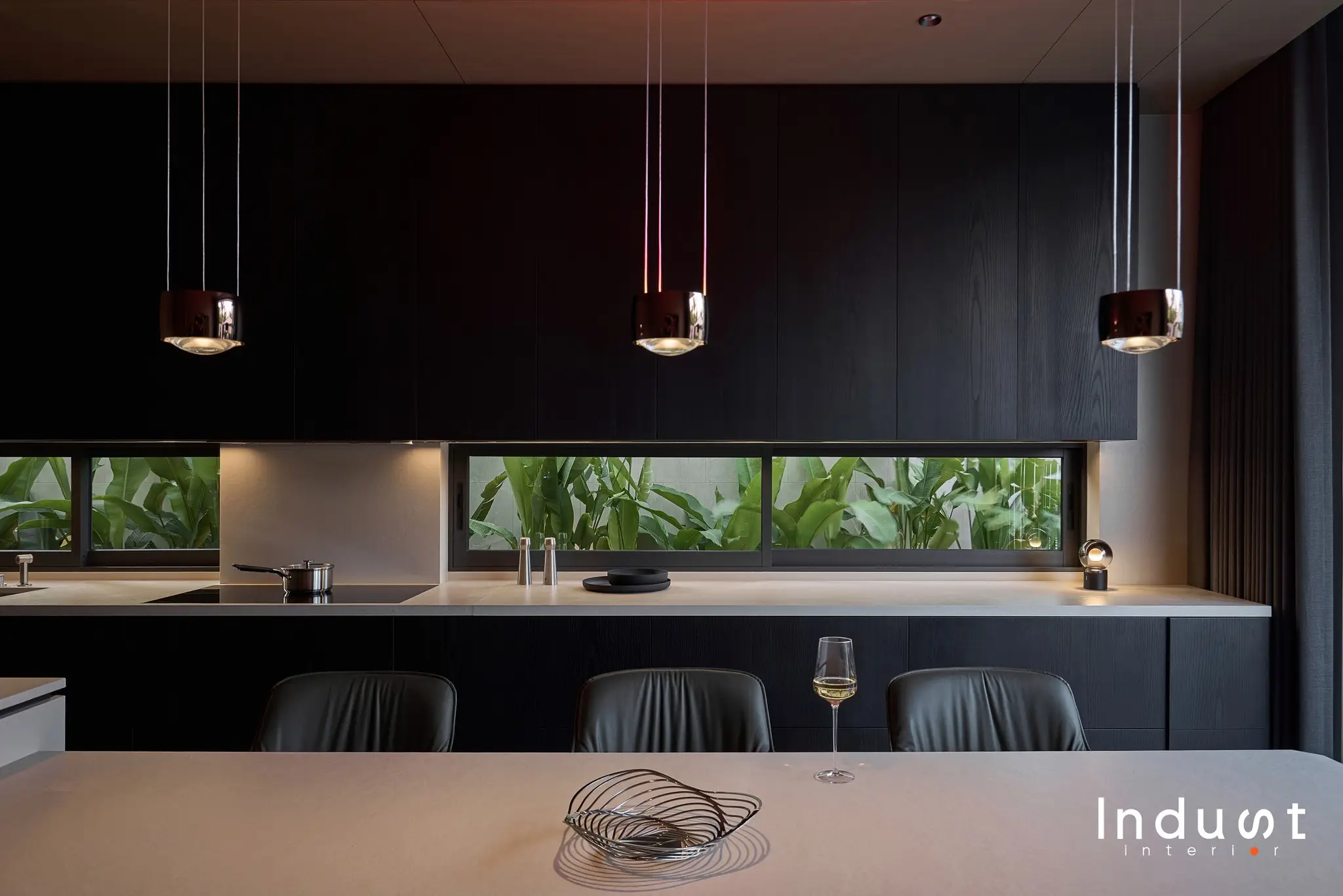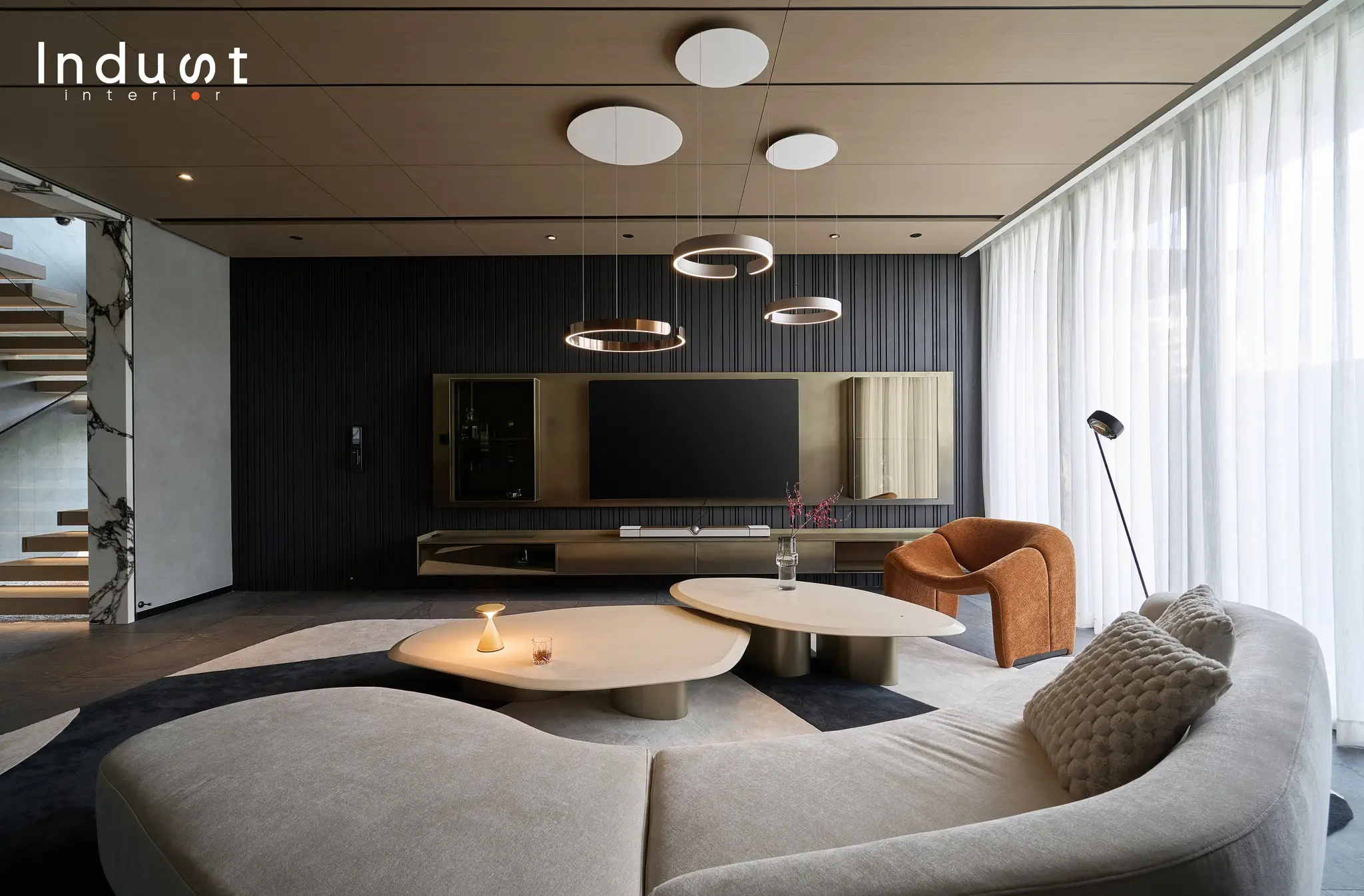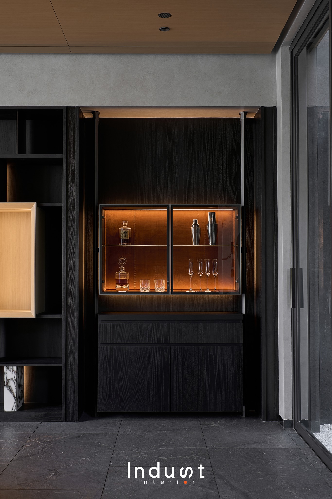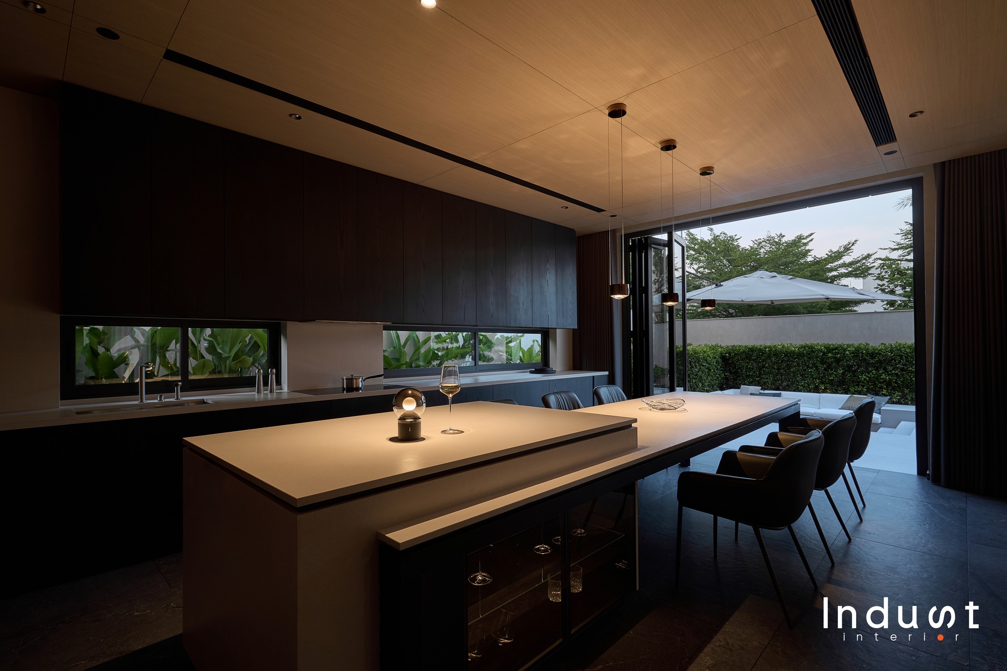 Tổ hợp khách – bếp được mở hoàn toàn về mặt thị giác, nhưng lại không bị hoà tan. Giữa hai không gian này là một lớp chuyển nhẹ, sảnh thang đóng vai trò như một “nút thắt mềm” về không gian. Khung bao cửa bằng đá cẩm thạch được đặt như một khung cảnh có chủ ý, nơi ánh sáng tràn qua cầu thang kính lớn và được dẫn dắt bằng nhịp trần ốp gỗ xuyên suốt. Cảm giác phân vùng được gợi nhẹ không rõ ranh giới, nhưng vẫn có nhịp điệu, cho phép hai không gian vừa kết nối vừa tách biệt trong một sự linh hoạt đầy chủ đích.