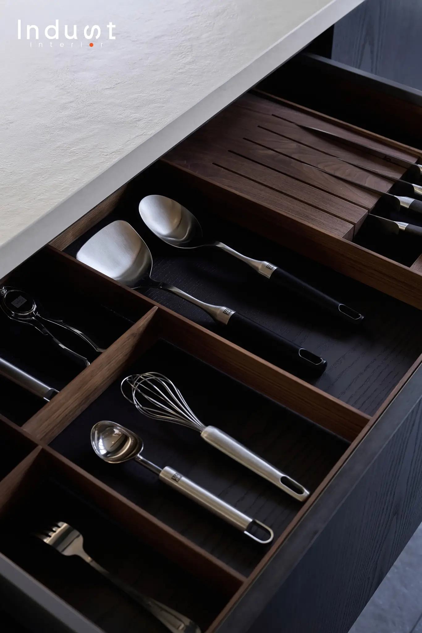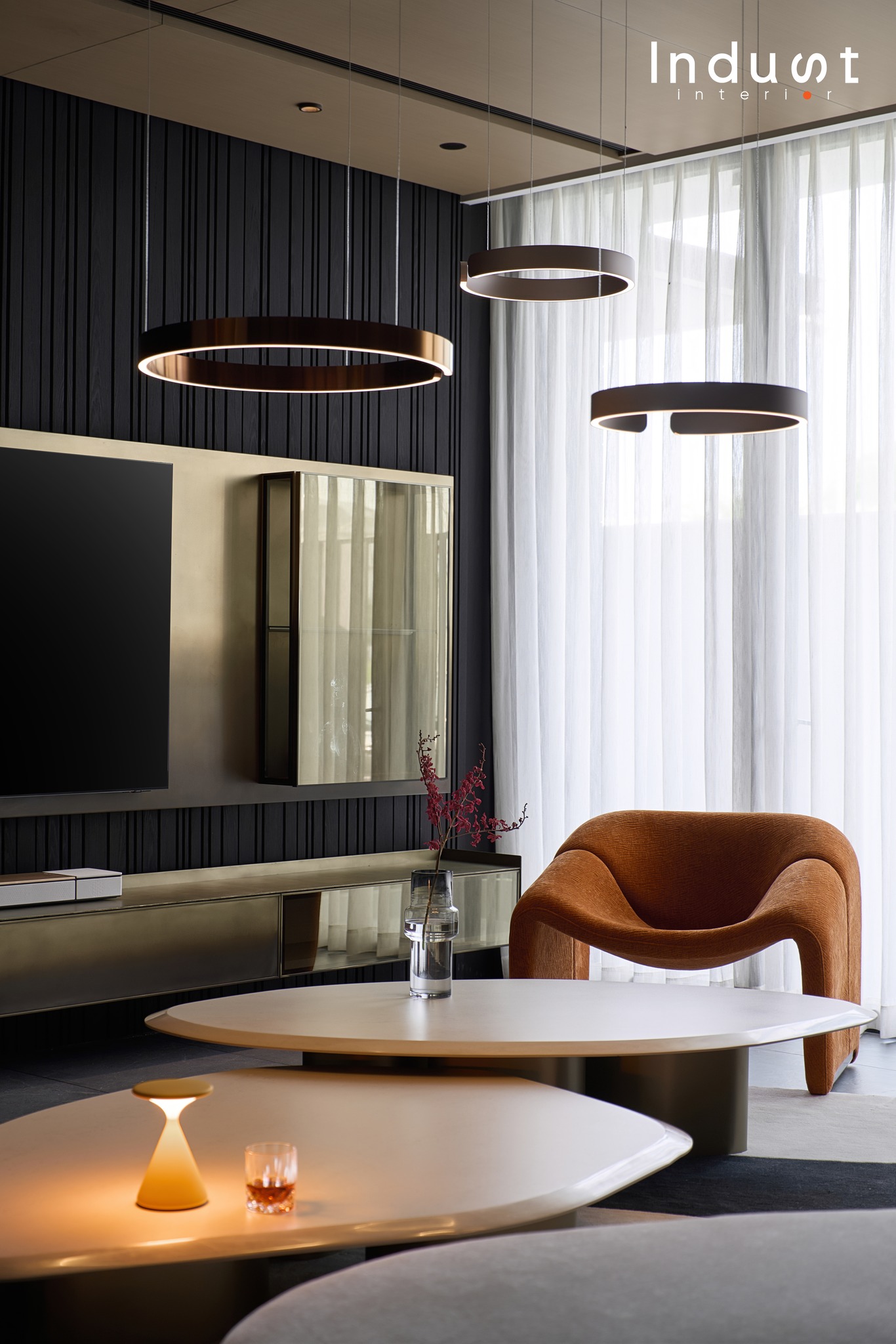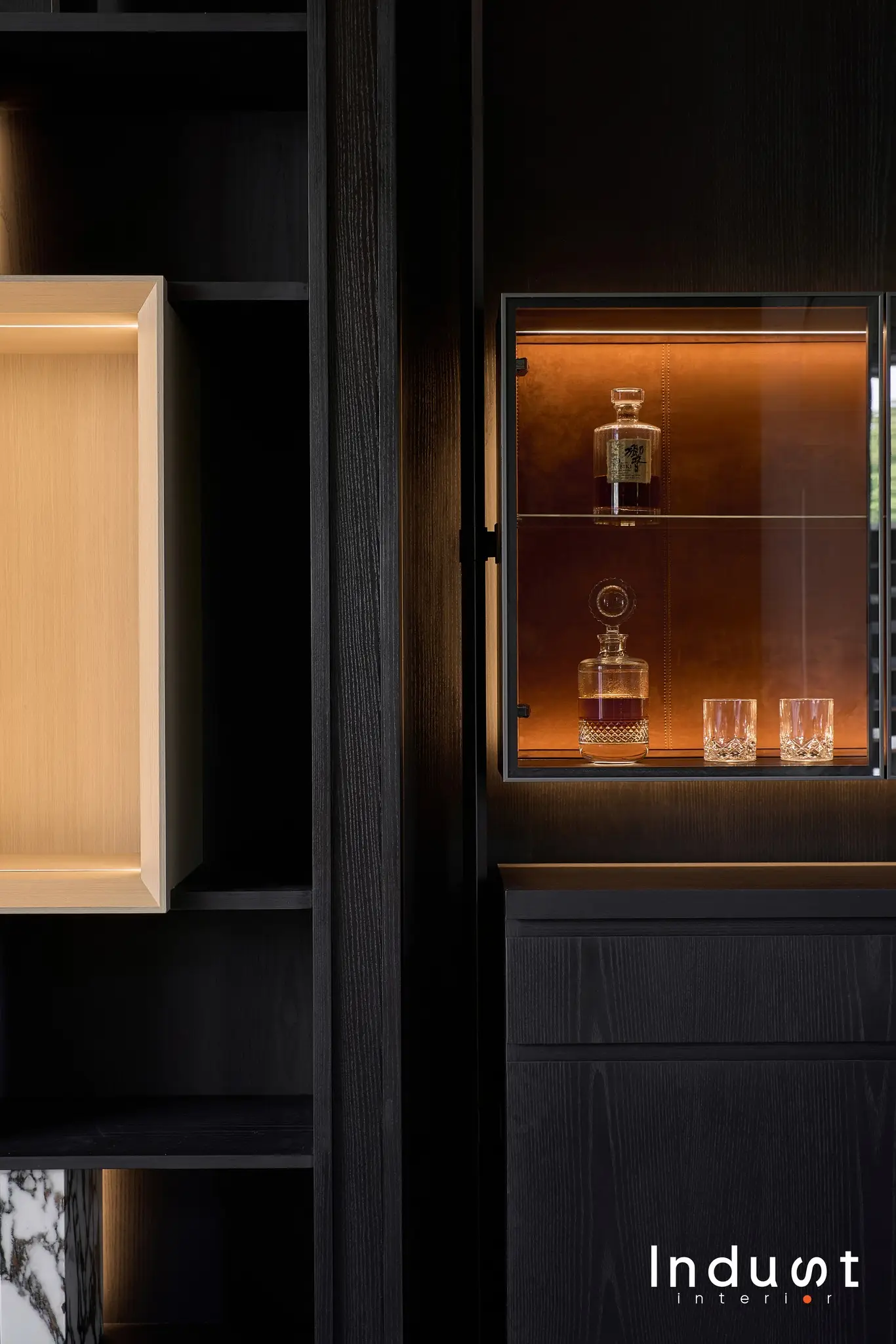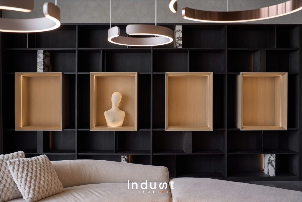 Không có chi tiết nào là dư thừa. Mỗi bề mặt ở đây đều được cân nhắc như một phần của ngôn ngữ cảm xúc: Veneer gỗ Tần Bì được đặt gia công riêng, phối kết giữa phôi vân mây và vân sọc, tạo nên một hiệu ứng thị giác sống động nhưng không áp đặt. Tủ phòng khách được thiết kế bespoke, với chất cảm kim loại đồng thau được patina nhẹ vừa đủ để phản chiếu ánh sáng, tương phản tinh tế với nền vật liệu mộc xung quanh. Ánh sáng tự nhiên không bị che lấp mà được mời gọi, di chuyển qua từng lớp vật liệu, từng khoảng thở làm nổi lên chất lượng không gian hơn là bản thân đồ đạc.