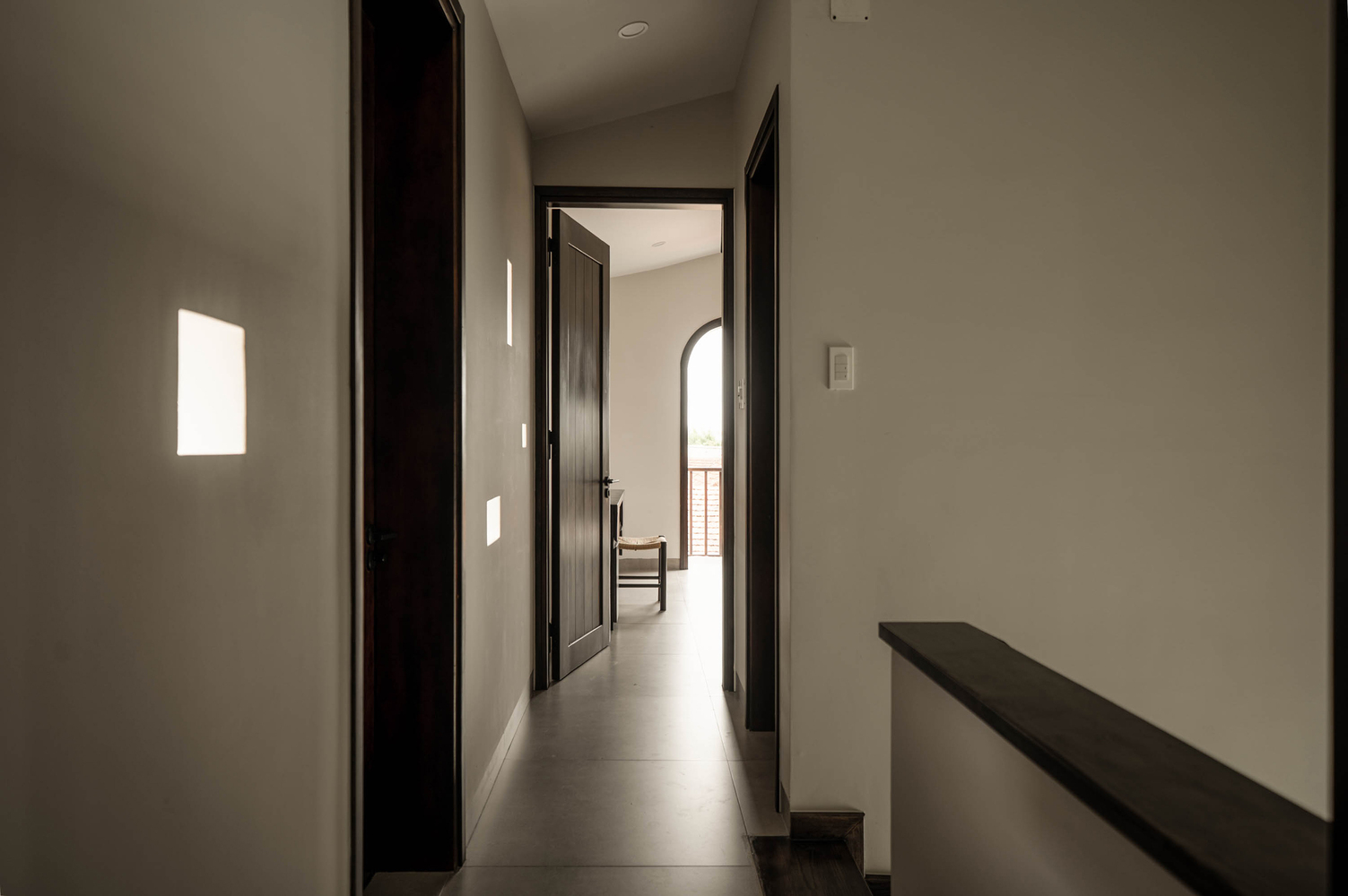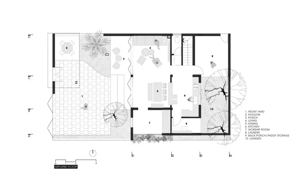 Theo phương án của chúng tôi, một gian (gian) và một chái đã được dỡ bỏ. Tầng trệt hiện có hai gian dành cho khu vực sinh hoạt chung gồm phòng khách, bếp và phòng ăn, và một chái dành riêng cho việc thờ cúng. Toàn bộ tầng trệt được thiết kế theo không gian mở, cho phép thông gió, chiếu sáng tự nhiên và kết nối trực tiếp với khu vườn. Khối phòng ngủ có hình dạng chái ngang và được bố trí ở tầng trên, đảm bảo sự riêng tư và dễ dàng lắp đặt điều hòa không khí.