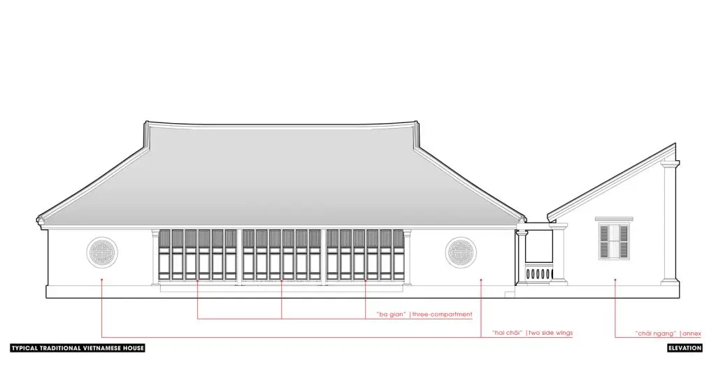 Mô tả văn bản do các kiến ​​trúc sư cung cấp. Nhà ba gian, hai chái là một đặc trưng của kiến ​​trúc nông thôn truyền thống Việt Nam. Tên gọi phản ánh cấu trúc của nó: ba gian giữa ( gian ), với gian giữa dùng làm nơi tiếp khách và thờ cúng tổ tiên, và hai gian bên hông dùng làm phòng ngủ hoặc phòng khách. Hai bên sảnh chính là hai chái nhỏ hơn ( gái ), thường được dùng làm bếp, kho chứa đồ, hoặc phòng ngủ phụ.