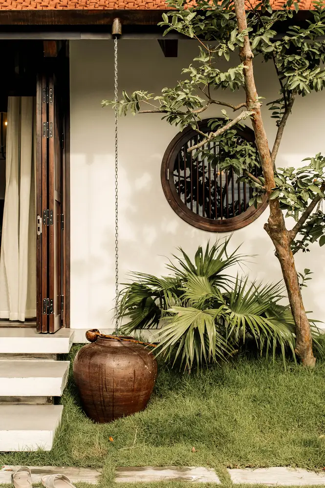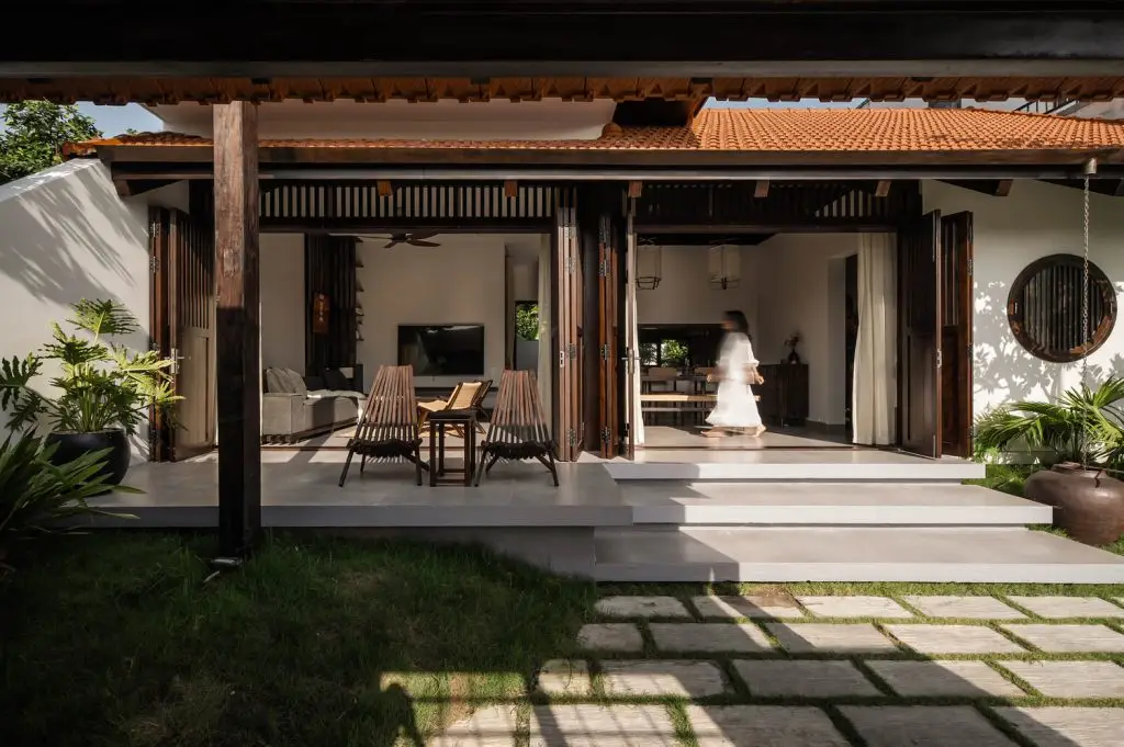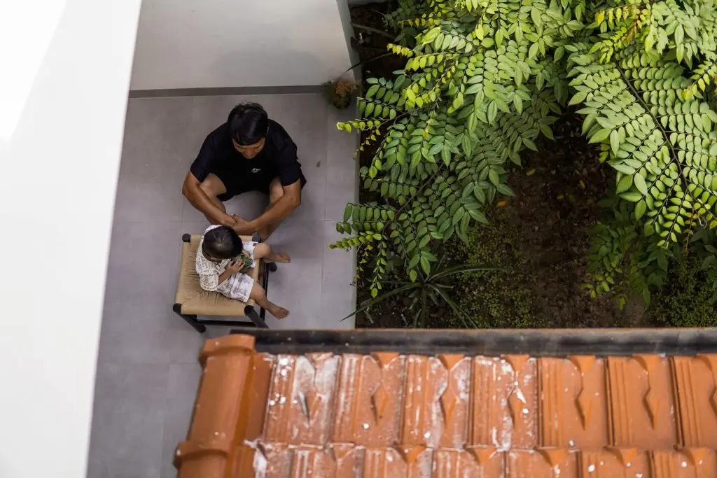 Ngoài không gian chính, chúng tôi còn bố trí nhiều khu vực ngoài trời hoặc bán ngoài trời — những không gian linh hoạt cho trẻ em vui chơi, phơi lúa, hoặc đơn giản là để chủ nhà thưởng thức trà. Các yếu tố văn hóa và lối sống vẫn được giữ nguyên: một khoảng sân rộng rãi để tụ họp cộng đồng, một bình đựng nước mưa để giặt giũ sau khi làm đồng, và một sân sau để trồng rau và gia cầm.