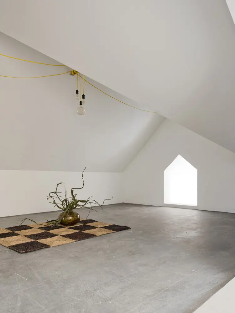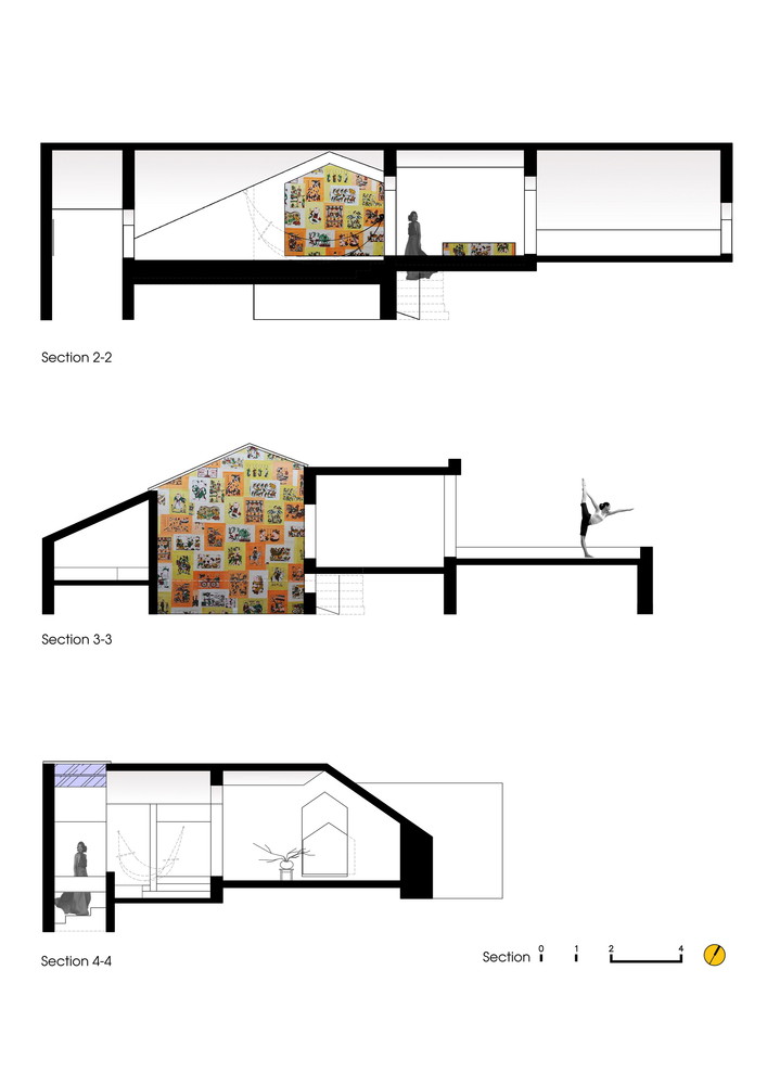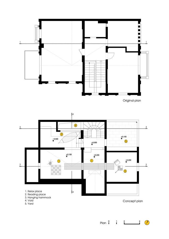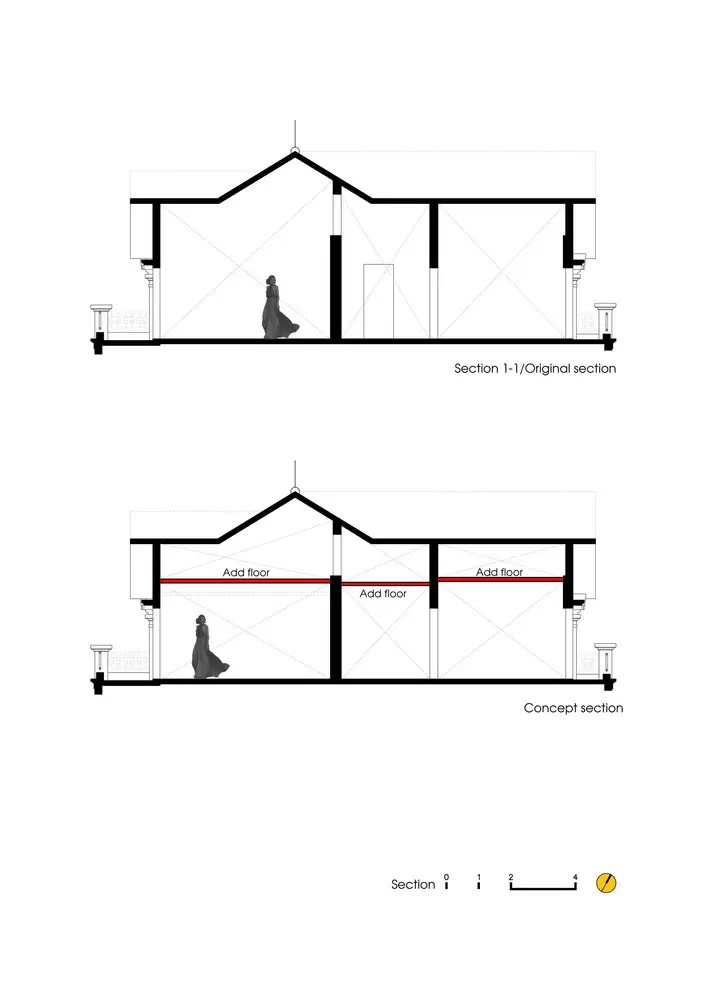 Mô tả bằng văn bản do các kiến ​​trúc sư cung cấp. Không gian này ban đầu là phần trên của phòng ngủ (ở tầng 3 ) của biệt thự cũ, nơi lắp đặt nhiều hệ thống kỹ thuật (hệ thống điện, hệ thống cấp nước và điều hòa không khí), và phần này khá cao. Chúng tôi đã thêm một tầng nữa để chia chiều cao thành hai phần với mục đích tạo thêm một tầng (trong khi đó, phòng ngủ bên dưới vẫn giữ nguyên chiều cao) để làm kho.