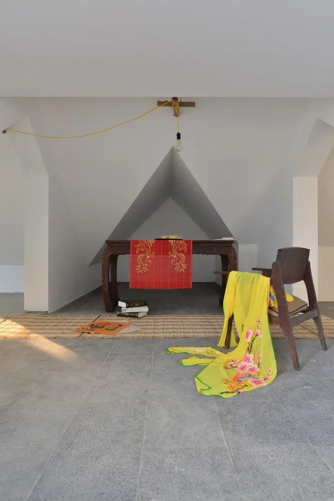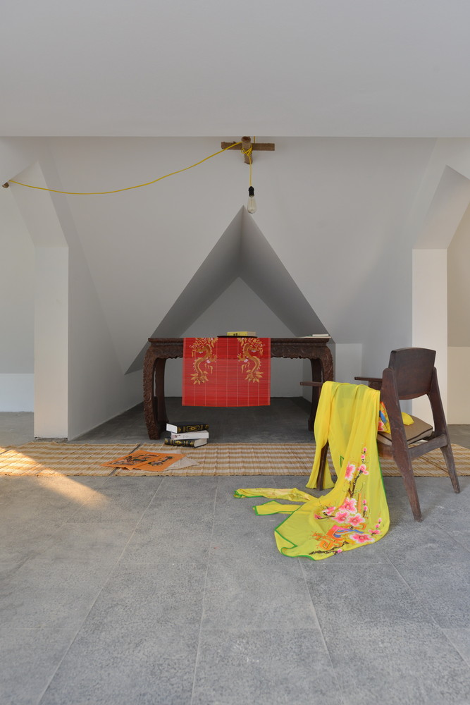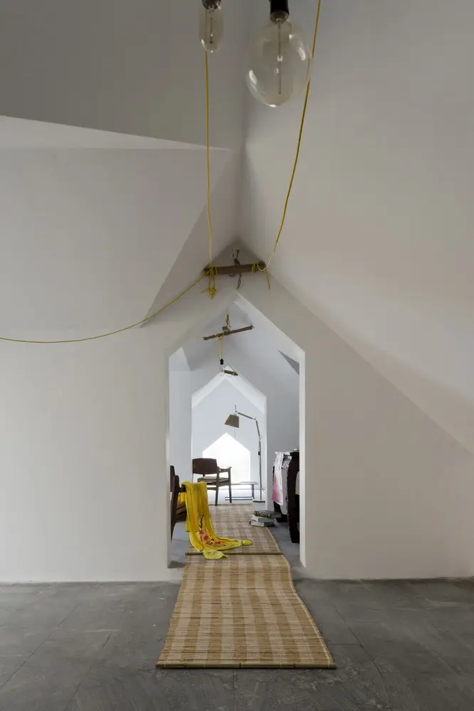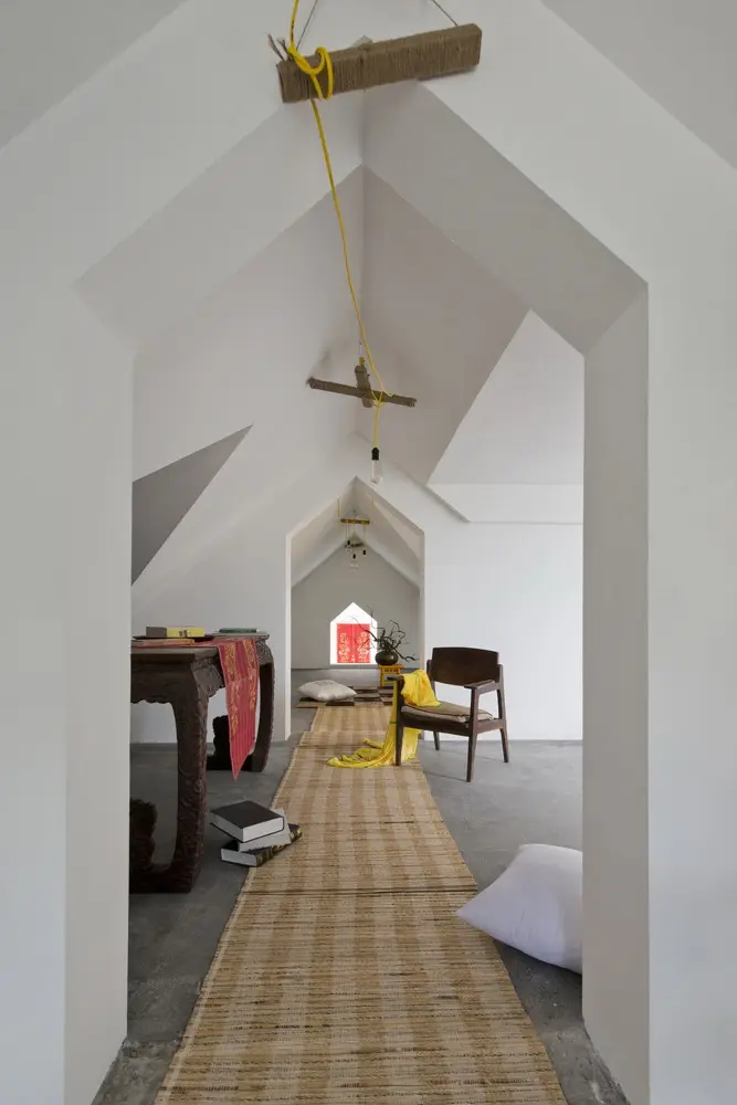 Cầu thang được di dời đến một vị trí khác (phù hợp với chức năng của tất cả các tầng bên dưới) để tạo cảm giác cao hơn khi lên mái nhà, nhưng mái nhà vẫn giữ nguyên. Hơn nữa, việc tận dụng hệ thống dầm ngang trên mái cũng giúp tạo ra nhiều lớp không gian khác nhau. Thêm vào đó, chúng tôi cũng sử dụng đường chéo cũ và kết hợp với các vòm ngang để tạo nên một tổng thể thống nhất – nghệ thuật gấp giấy origami.