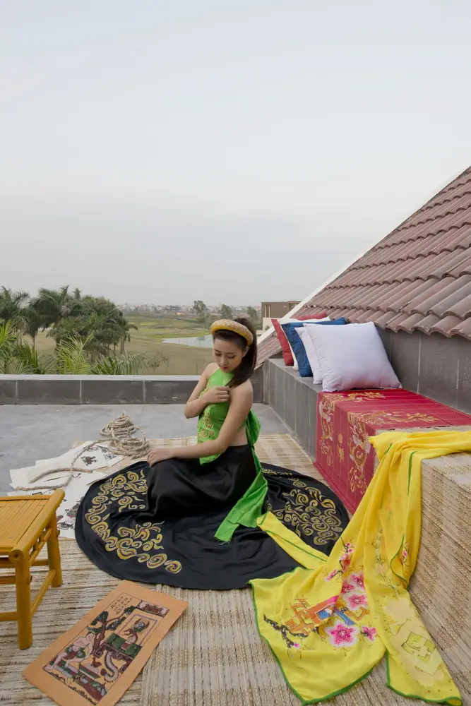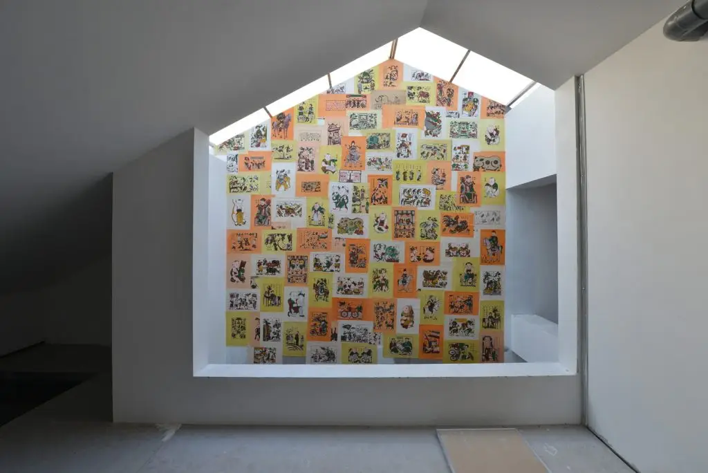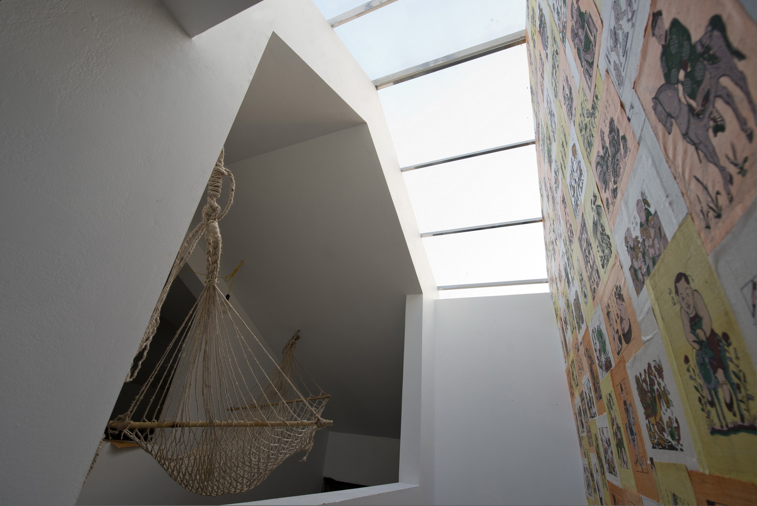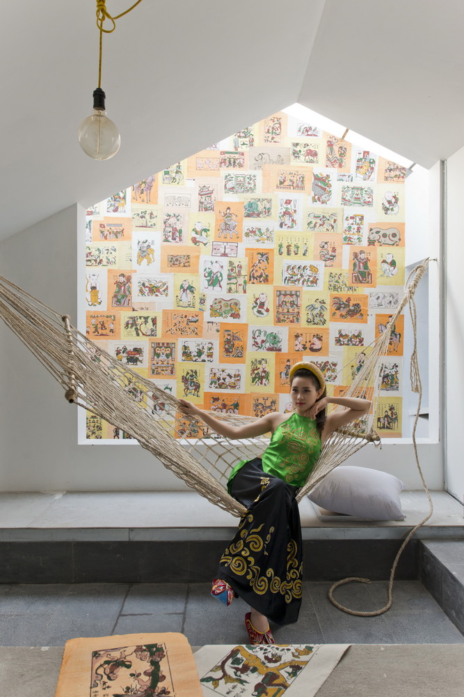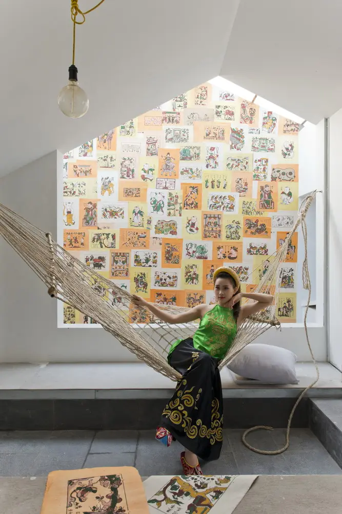 Dưới mái kính của không gian trống trải có một bức tường treo tranh Đông Hồ (một loại tranh dân gian Việt Nam).