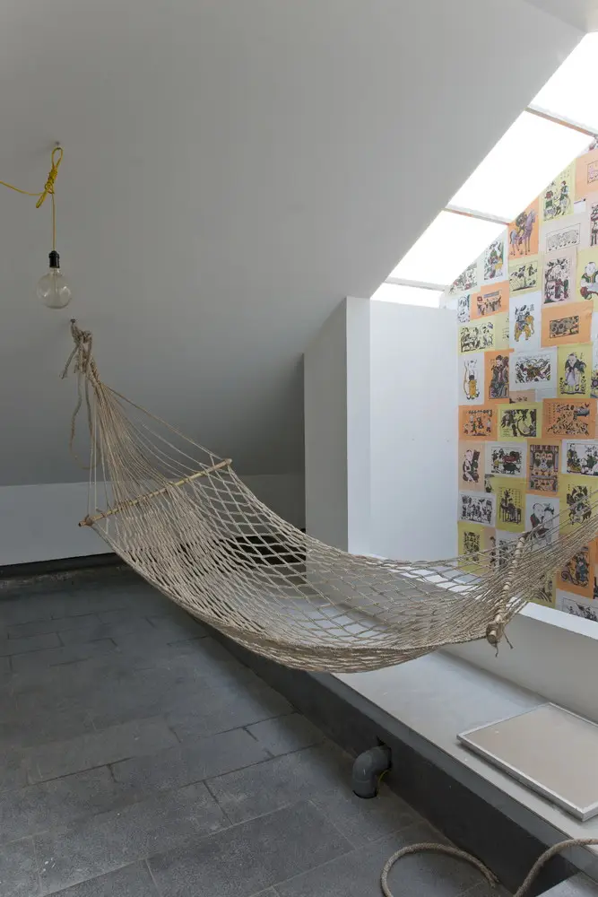 Không gian để treo võng được bố trí cao hơn vì có nhà vệ sinh ở tầng dưới. Bên cạnh không gian này, chúng tôi tạo một khoảng trống để lấy ánh sáng cho toàn bộ các tầng dưới và cũng biến nó thành điểm nhấn cho ý tưởng thiết kế này.