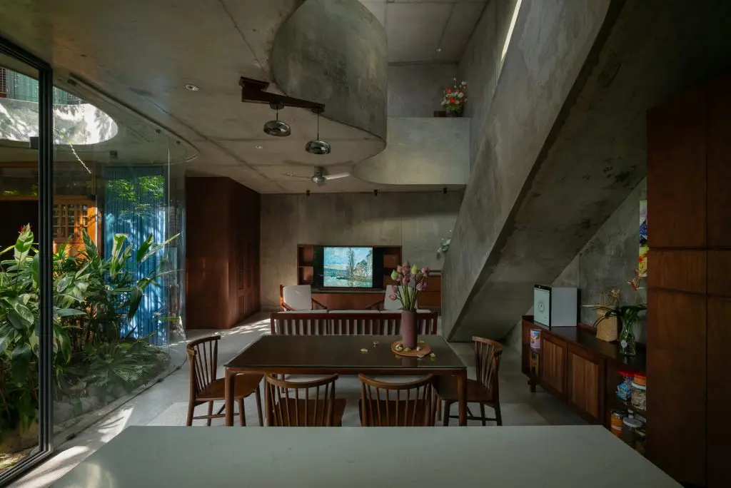 4. Tối ưu hóa kích thước hạn chế: Khu đất có chiều sâu hạn chế, diện tích mỗi sàn khoảng 40m2 nhưng khoảng lùi quy hoạch lớn – điều này làm tăng thách thức về diện tích sử dụng. Để tránh cảm giác chật chội và tăng độ thông thoáng, những bức tường kiên cố được hạn chế tối đa. Thay vào đó, các khối gỗ xác định không gian riêng tư trong khi các tấm kính lớn được sử dụng để mở tầm nhìn ra vườn và mang lại ánh sáng tự nhiên vào ban ngày. Độ nhám của vật liệu (đá núi lửa, đá mài, xi măng đánh bóng…) kết hợp với tông màu trầm chủ đạo tạo nên sự mát mẻ, đồng thời tăng vẻ sang trọng cho công trình.
